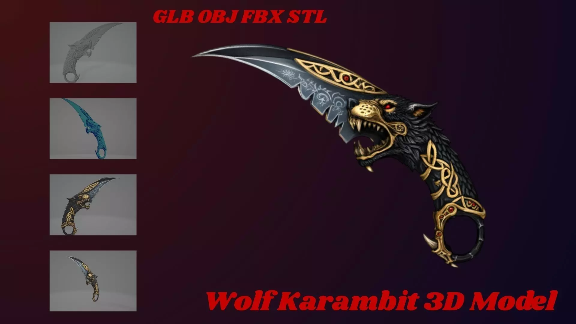 Bring a fierce fantasy weapon to your project with this highly detailed Wolf Karambit 3D Model. Designed with an aggressive wolf-head handle, glowing red eyes, engraved blade patterns, and premium ornamental details, this model is perfect for games, cinematics, collectibles, and 3D printing.This karambit combines dark fantasy aesthetics with realistic metallic textures, making it ideal for RPG, action, or medieval-themed projects.