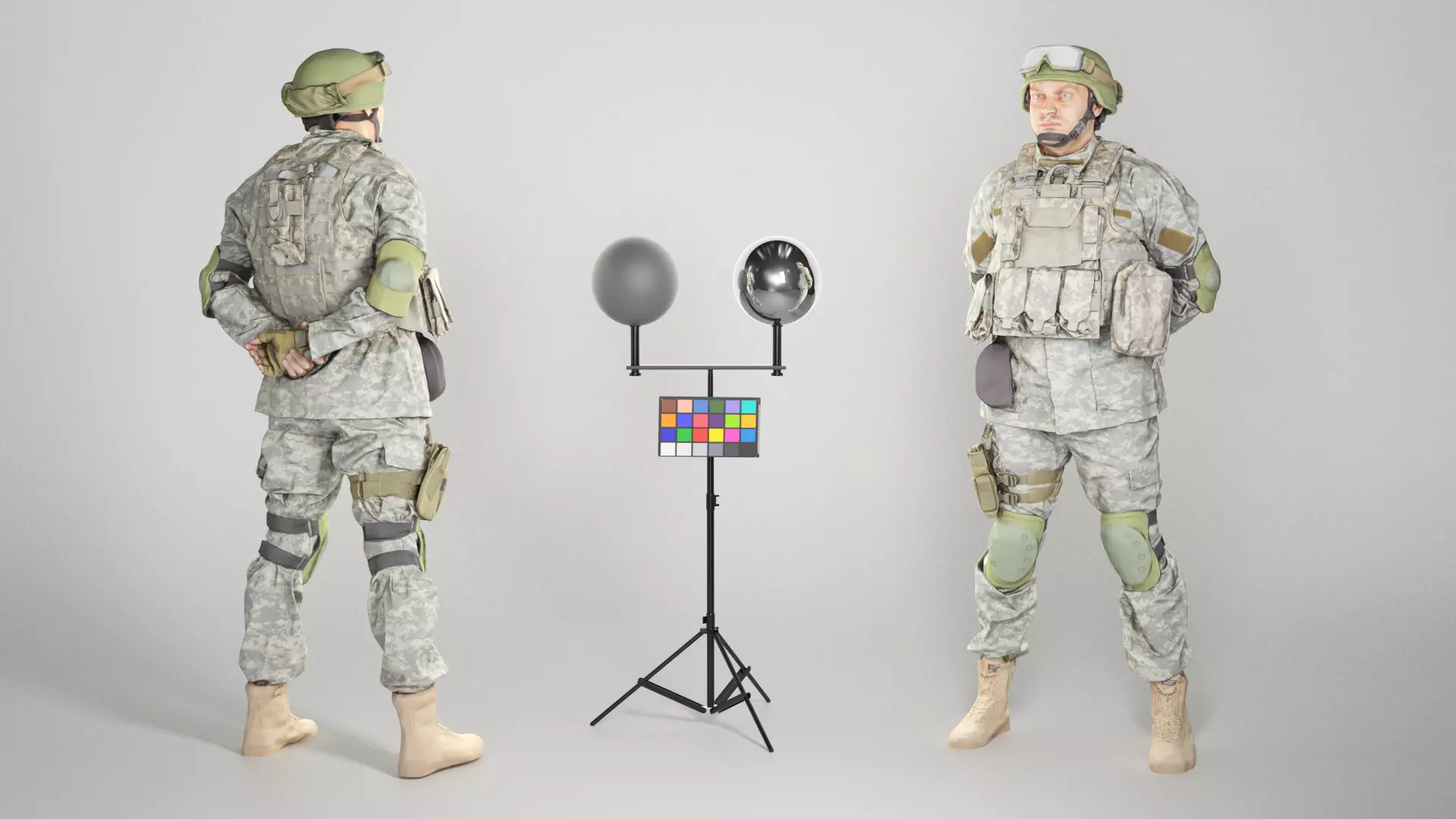 This is a true human size detailed model of a brave soldier dressed in American military uniform. The model is captured in casual pose to be perfectly matching to variety of architectural visualization, background character, reconstruction, performance, etc.