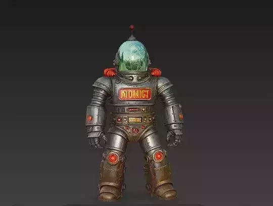 A high-quality 3D model of a classic atomic-age robot, professionally optimized for real-time engines, VR/AR, and cinematic rendering. This asset features a Raypunk aesthetic with weathered metallic surfaces, glowing atomic core details, and a vintage sci-fi silhouette. Built with a professional PBR workflow, it provides authentic material responses under any modern lighting condition.