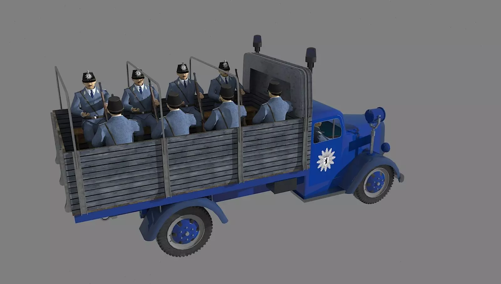 Berlin police task force of the 1950s, also known as the raid command. The police officers wear uniform model 47. The shako was introduced in 1951 and was worn until the 1960s.In order to give the police a uniform, uniformed image in public, it was decided in 1947 to obtain a uniform uniform for the three western sectors, which was issued at the beginning of 1948 and was called the Model 47.The police officers wear this model, which was worn until the Lippschitz model was introduced in 1961. The black belt also contains the striped pouch, the so-called star box and the handgun. On the belt lock is the police star with the Berlin coat of arms.The black shako was presented to the Berlin population on September 30th, 1951 on the occasion of the large police show in the Olympic Stadium. Before that, a peaked cap in the same color as the uniform was worn on Model 47. The patrol officer wore long cloth trousers with his skirt; boot trousers were also used for special units.