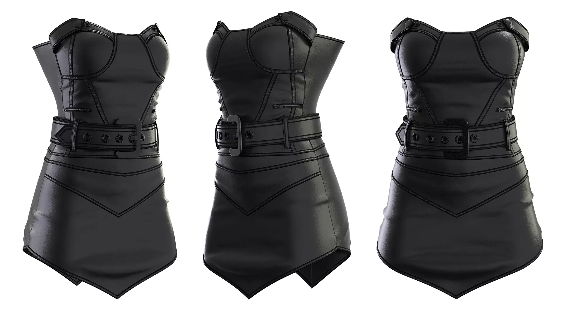 Black Leather Corset Dress – a stylish and detailed 3D model featuring a strapless corset-style top, high-quality leather texture, and decorative stitching. Designed with a fitted silhouette and a matching belt, this dress is perfect for use in fashion visualization, character design, games, and animation projects. The model includes realistic materials and clean topology for seamless integration into your 3D workflow.