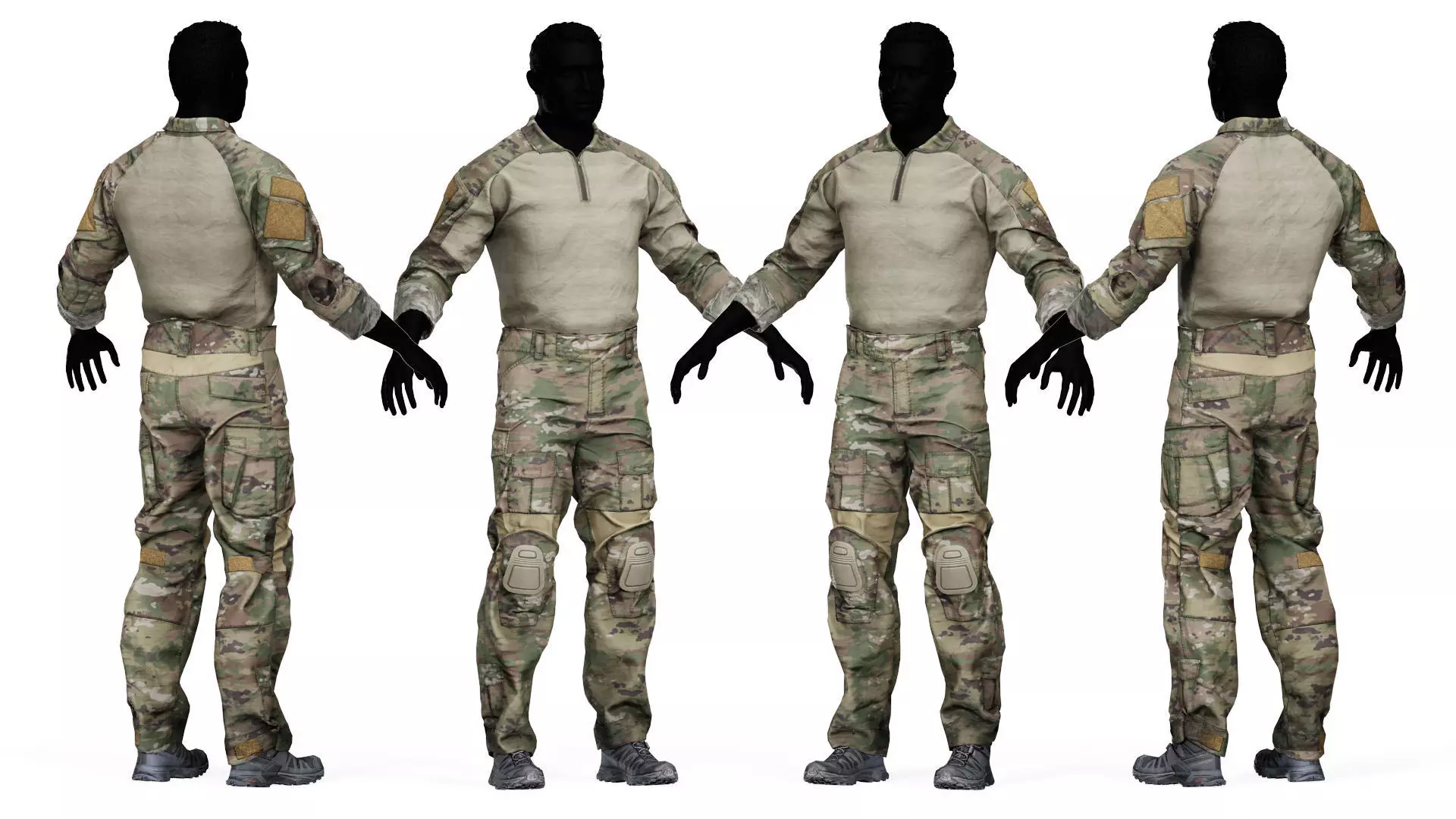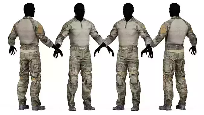 10 variants available of rolled sleeves, tucked in/out shirt, neck collar up/down + removable knee and elbow pads. Boots are not included but can be found here:https://www.cgtrader.com/3d-models/military/military-character/salomon-x-ultra-4-boots