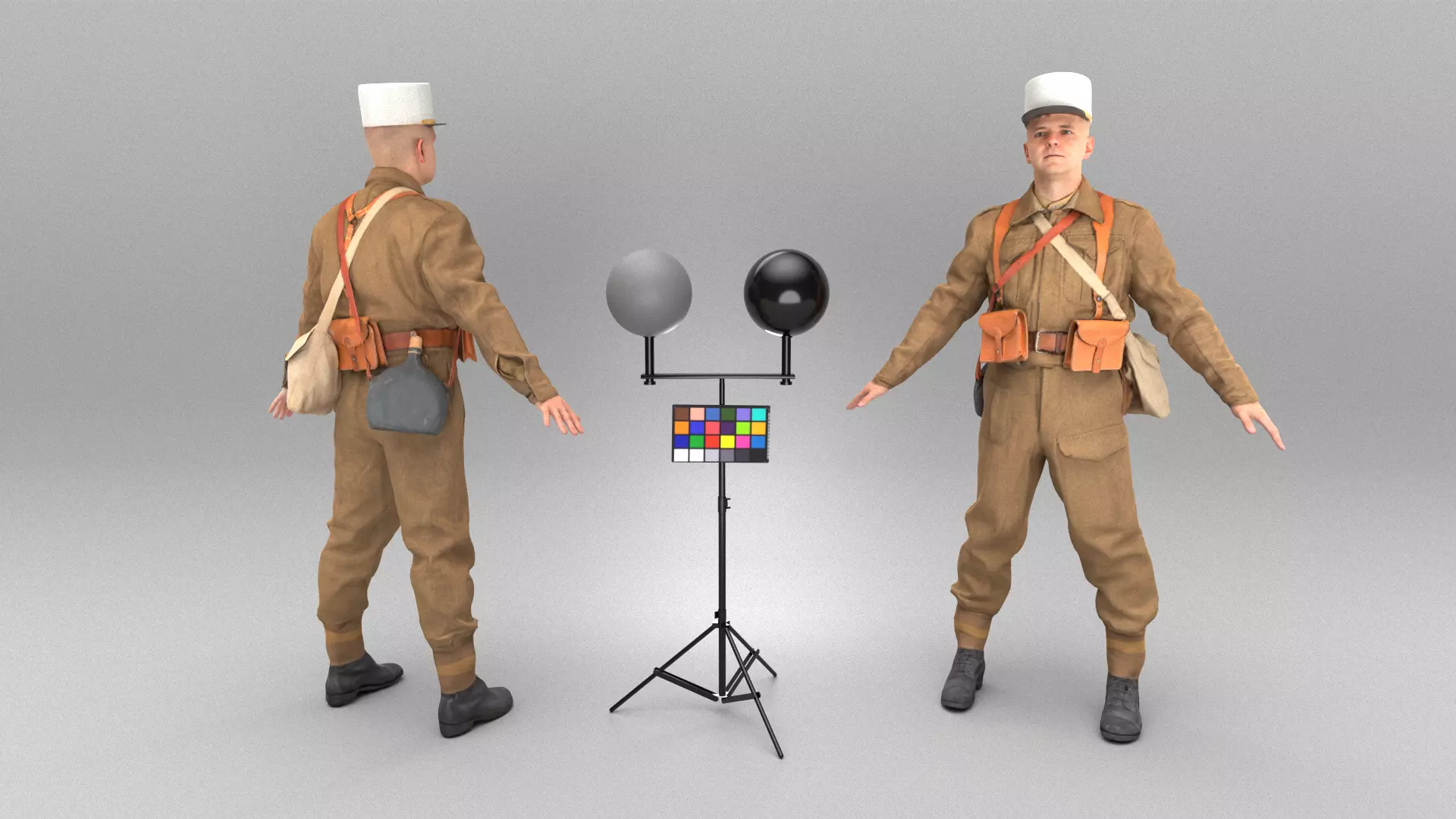 This is a true human size and detailed model of a French infantry character from 1940s. All props and suit are original. The model is captured in the A-pose with mesh ready for rigging and animation in all most usable 3d software.