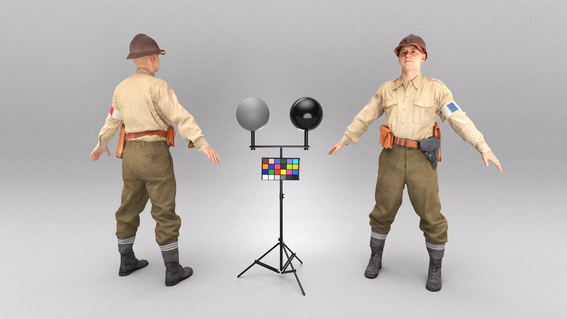 This is a true human size and detailed model of a French partisan character from 1940s. All props and suit are original. The model is captured in the A-pose with mesh ready for rigging and animation in all most usable 3d software.