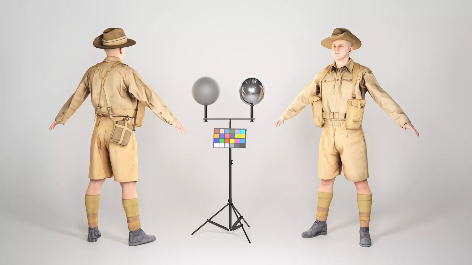 This is a true human size and detailed model of a Australian infantryman character from 1940s, in original historically accurate suit, with lost of props, which can be separated any used individually. All models have PBR textures. The soldier is captured in the A-pose with mesh ready for rigging and animation in all most usable 3d software.