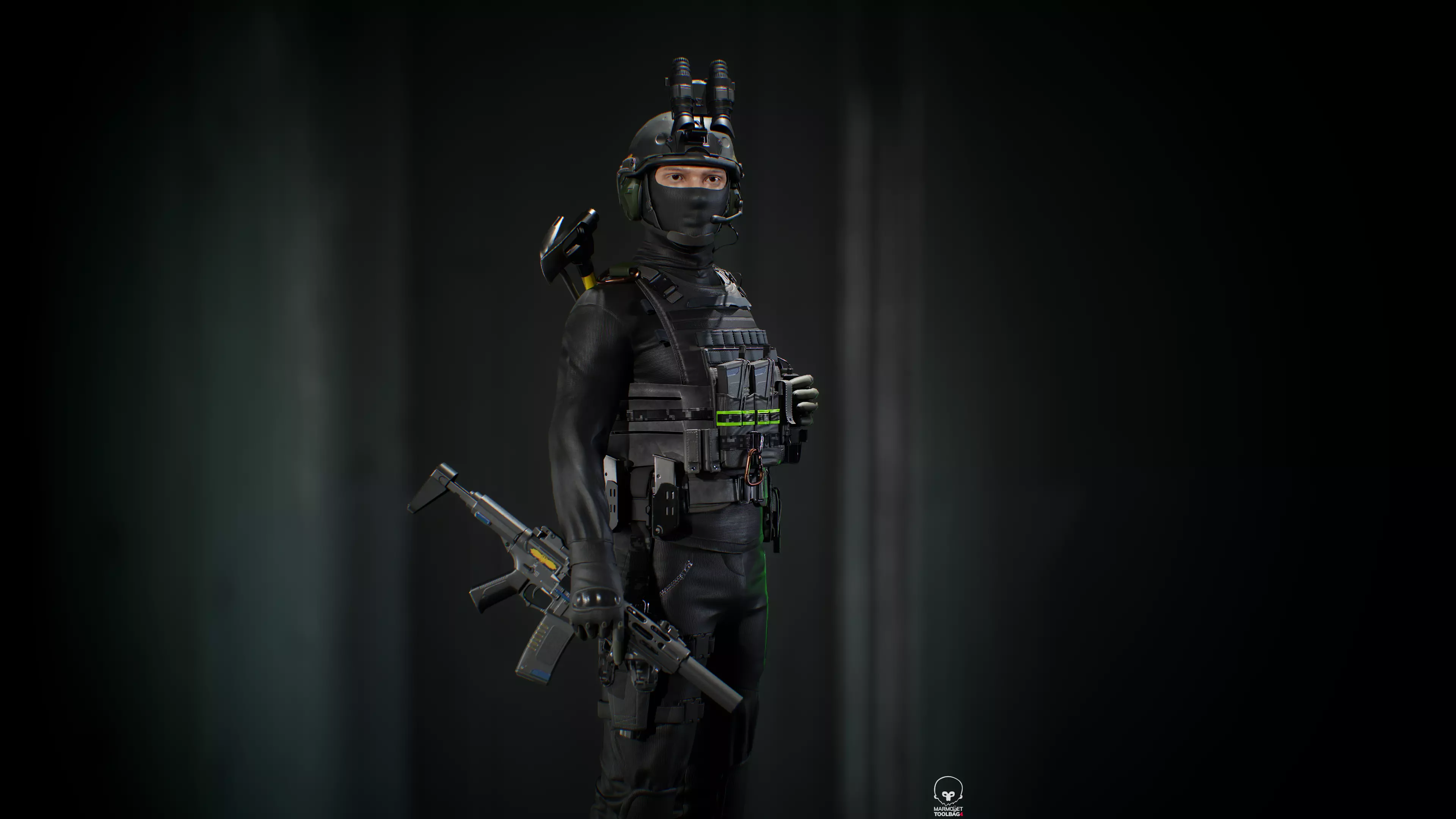 This game-ready soldier model was created in a full prodaction pipeline. In this pack u got: T-pose character,Posed character(like in a preview)all guns,granades and textures.All maps baked in marmoset in 4kTextured in substance painter in 4k. Normall map OpenGLMarmoset scene incluted.
