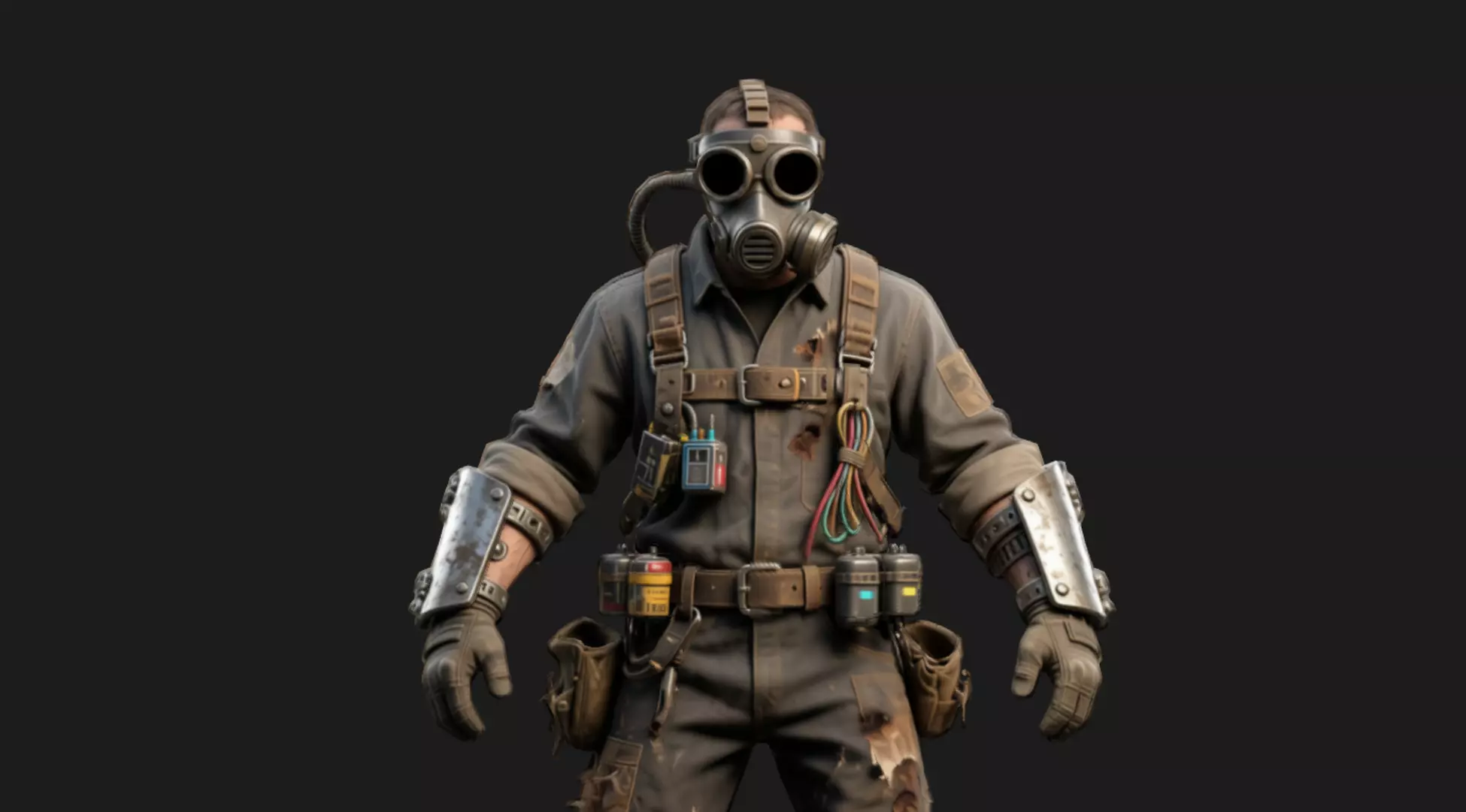 This asset features a rugged, weathered technician character dressed in a distressed industrial jumpsuit and heavy work boots. Key design elements include a unique, multi-lensed gas mask with intricate filtration systems, a utility belt laden with various pouches and tools, a forearm data gauntlet, and a detailed mechanical exoskeleton leg brace on the left leg. The character’s design combines functional scavenging gear with military-inspired utility, featuring layered, realistic wear and tear, patches, and realistic fabric folds that create a strong visual identity.