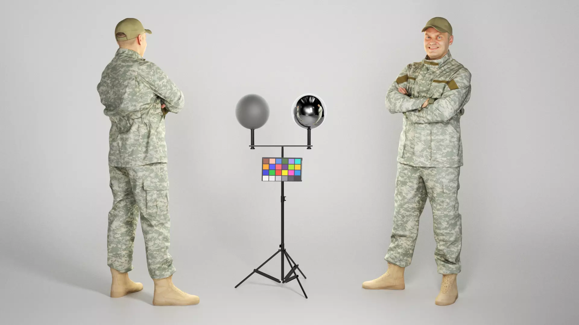 This is a true human size detailed model of a brave soldier dressed in American military uniform. The model is captured in casual pose to be perfectly matching to variety of architectural visualization, background character, reconstruction, performance, etc.
