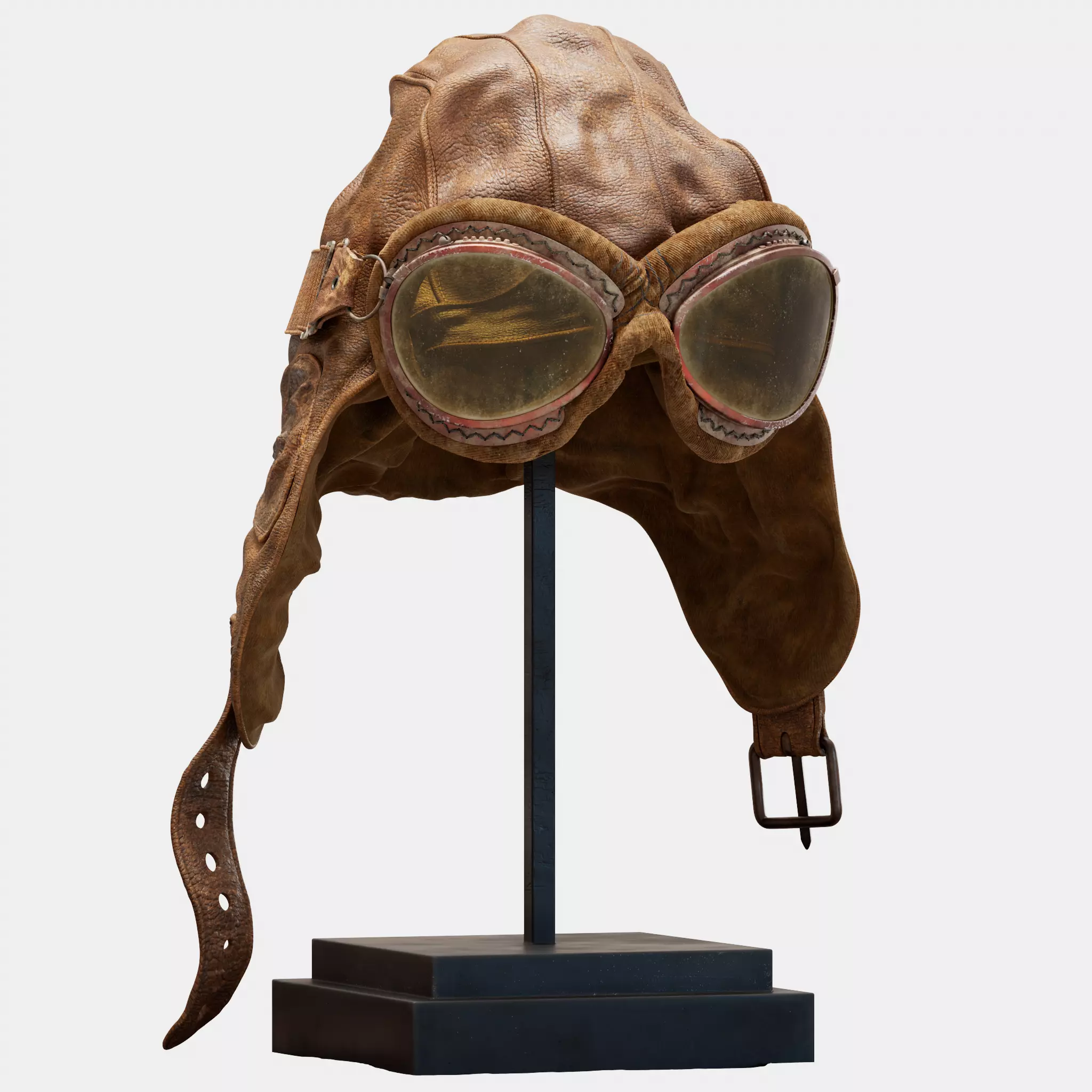 Discover this stunning 3D model of a vintage aviator helmet with goggles, meticulously detailed and perfect for your video game projects, animated films, or historical visualization.