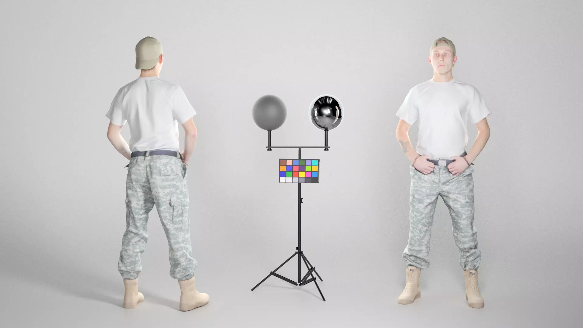This is a true human size detailed model of a brave soldier dressed in American uniform. The model is captured in casual pose to be perfectly matching to variety of architectural visualization, background character, reconstruction, performance, etc.