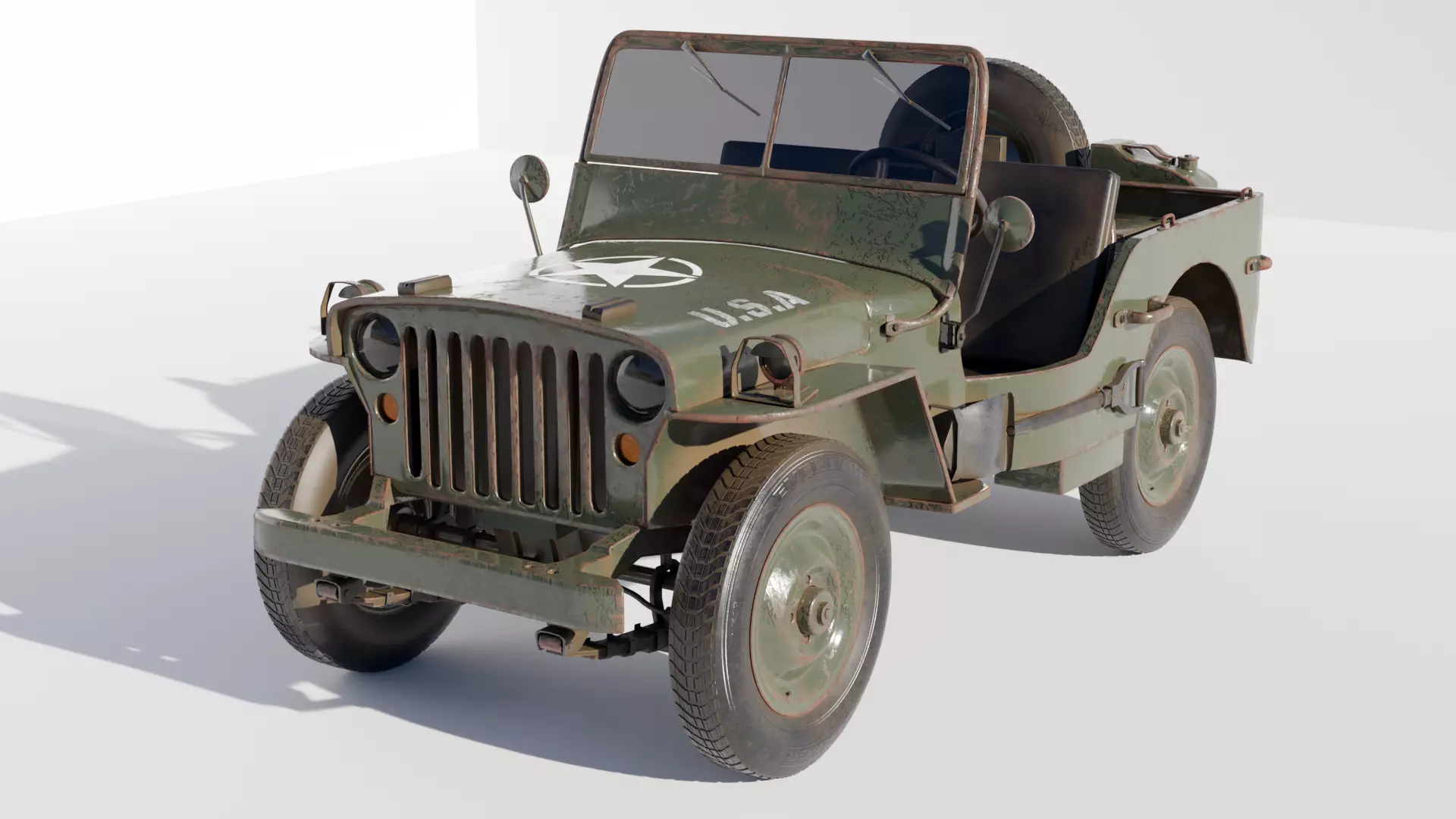 3d car model Willys MB. Realistic model with correct dimensions and proportions. The model is not an exact copy of the car. All details of the model are separated. If the buyer wishes, I can transfer a blender file with the unused modifier of the subdivision surface for easy editing of the model. The textures were applied in the substance painter and consist of three texture sets. Textures: BaseColor, Height, Metallic, Normal, Roughness and for glass opacity. Textures 4096x4096