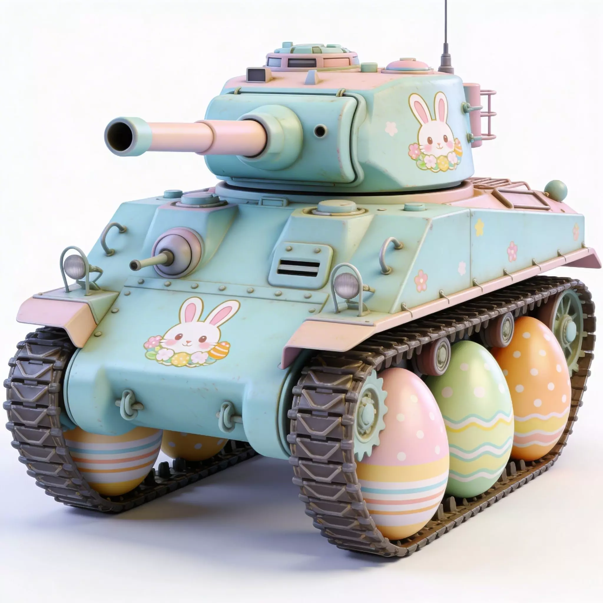 TAGSEaster Tank, 3D Model, Military Vehicle, Stylized, Pastel, Mint Green, Pink, Blue, Festive, Holiday, Bunny Decal, Floral, Egg Wheels, Armored Vehicle, Cannon, Tracks, Whimsical, Creative, High Detail, Rendering, Digital Art, Game Asset, Toy-like, Seasonal, Spring, Heavy Machinery, Character Design