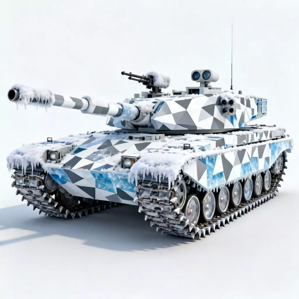 Geometric Winter Camouflage The tank is covered in a unique digital camouflage pattern. It uses sharp triangles of white, grey, and ice-blue to break up the shape of the vehicle, making it hard to spot against snow and icebergs.