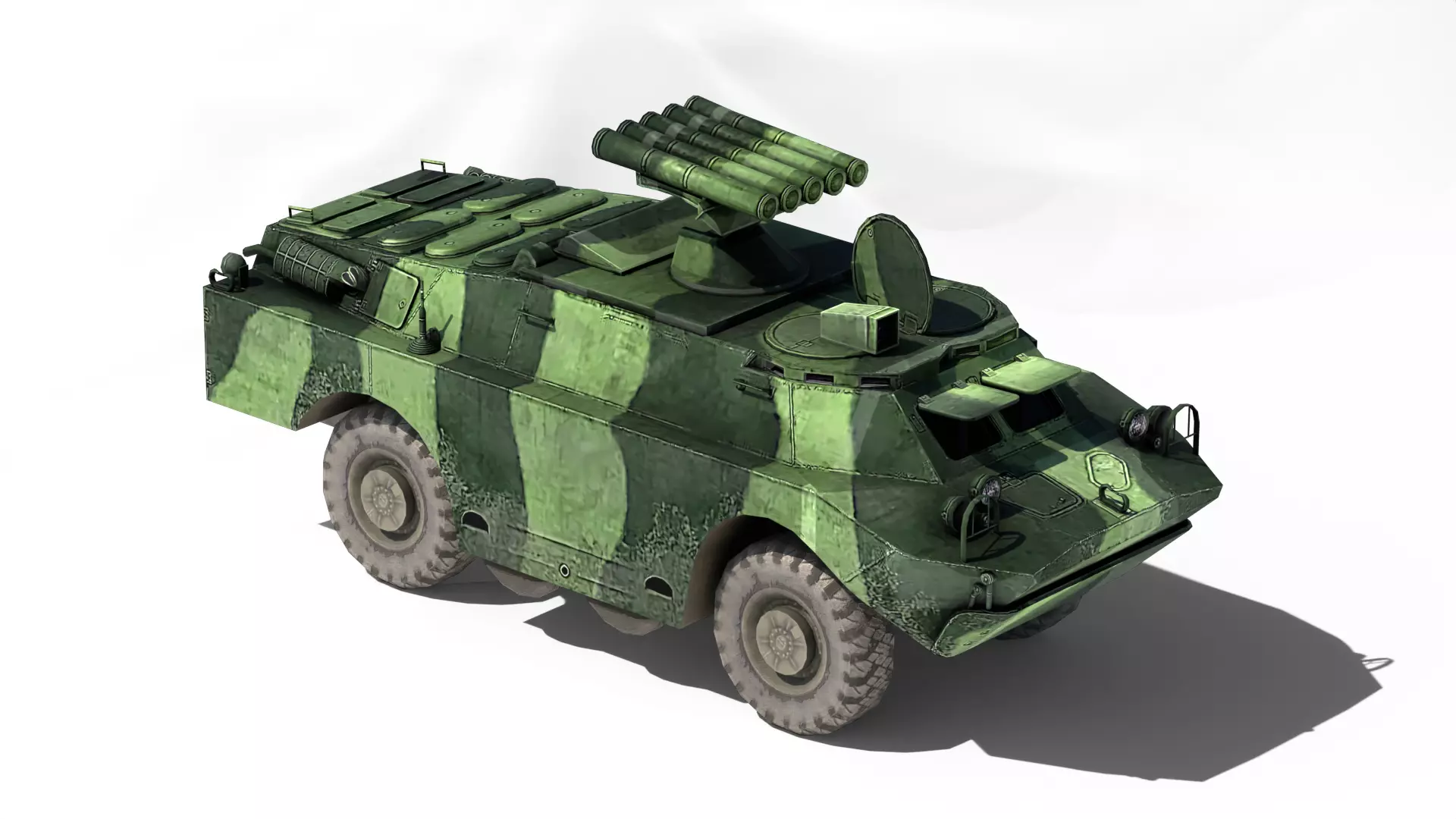 Blender Model , lowpoly ,rendered with cycles3 objects (BRDM body , wheels, and a missil)PBR 2k Textures , the body part has 8 differnt color/diffuse maps