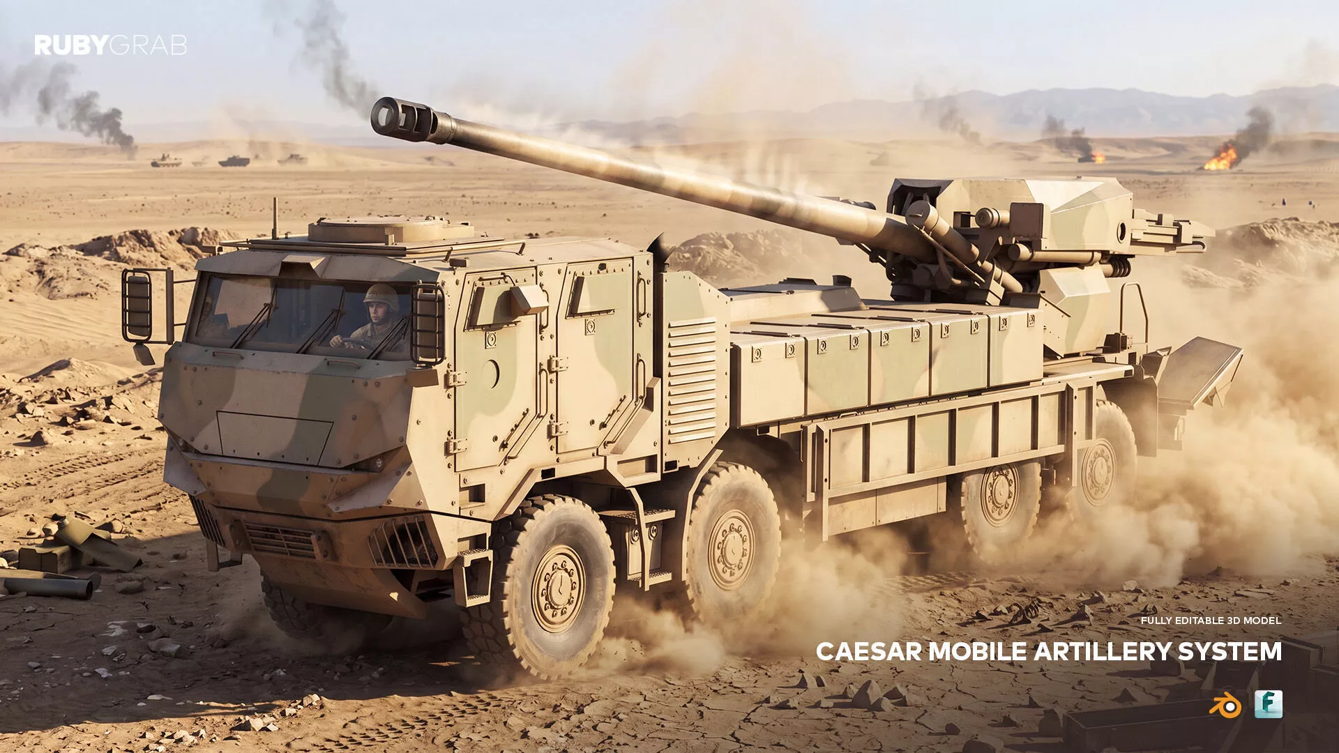 This is a detailed 3D model of the CAESAR Mobile Artillery System, a cutting-edge piece of battlefield technology designed for rapid deployment and precision fire support. The model includes movable parts, such as the gun barrel and support elements, providing a degree of interactivity and customization. While it is not a high-poly model, it is optimized for use as a supplementary asset in larger scenes, military simulations, or background elements in animations and renderings.
