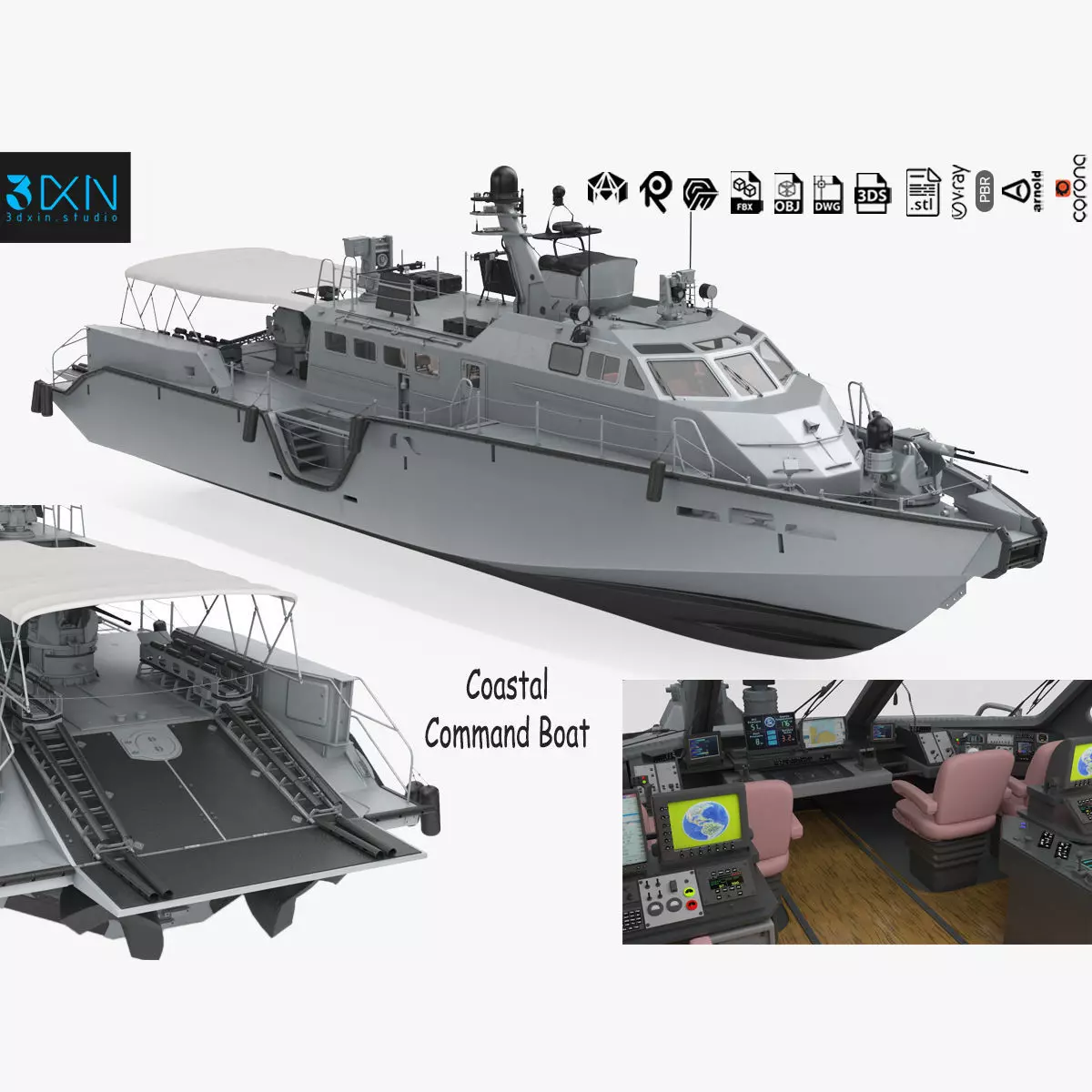 Coastal Command Patrol Boat is a high quality, photo realistic 3d model that will enhance detail and realism to any of your rendering projects. The model has a fully textured, detailed design that allows for close-up renders, and was modeled in 3ds Max 2018 also has 3ds Max 2015 version and rendered with V-Ray. Renders have no post-processing.
