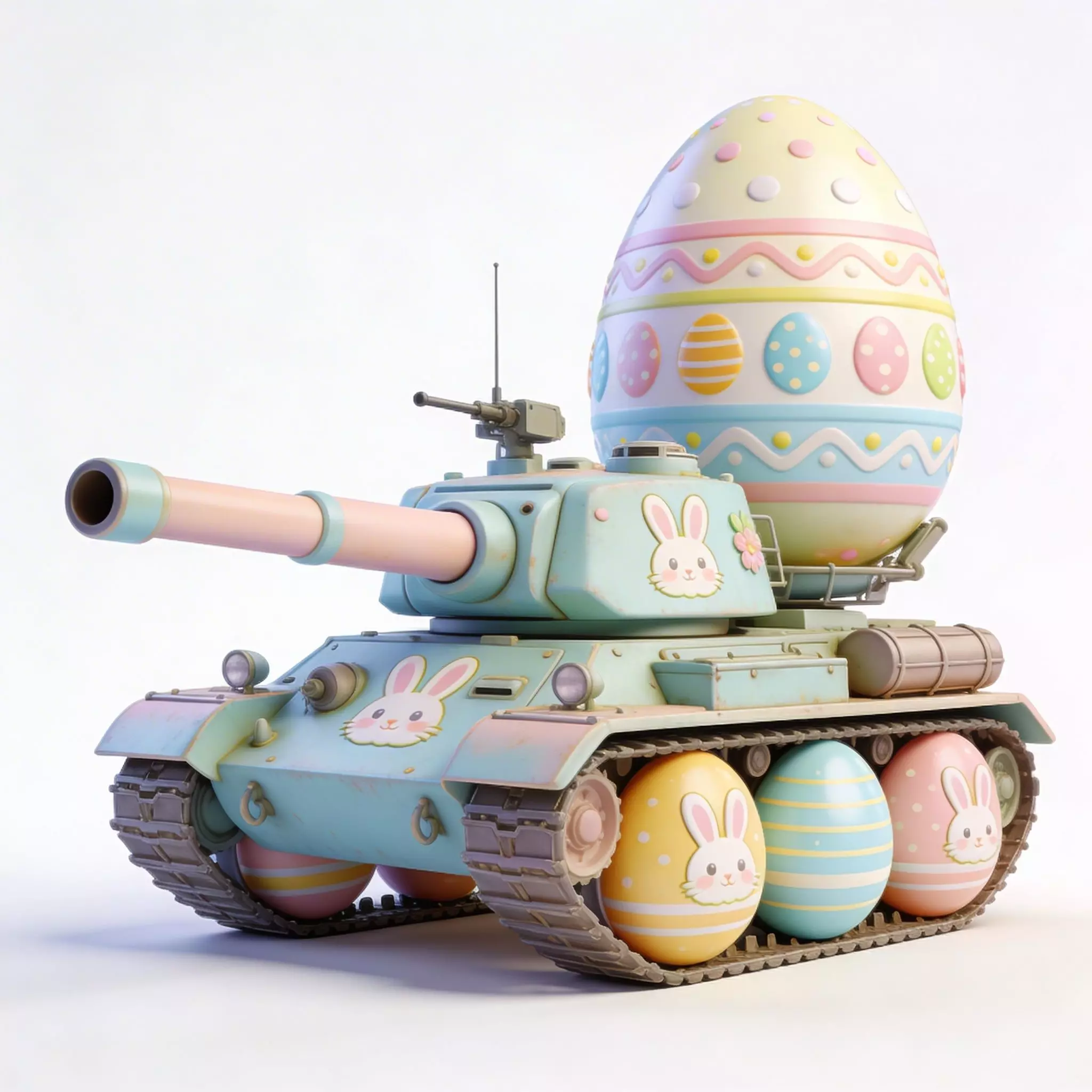 TAGSEaster Tank, 3D Model, Military Vehicle, Stylized, Pastel, Mint Green, Pink, Blue, Festive, Holiday, Bunny Decal, Floral, Giant Egg, Egg Wheels, Armored Vehicle, Cannon, Tracks, Whimsical, Creative, High Detail, Rendering, Digital Art, Game Asset, Toy-like, Seasonal, Spring, Heavy Machinery.