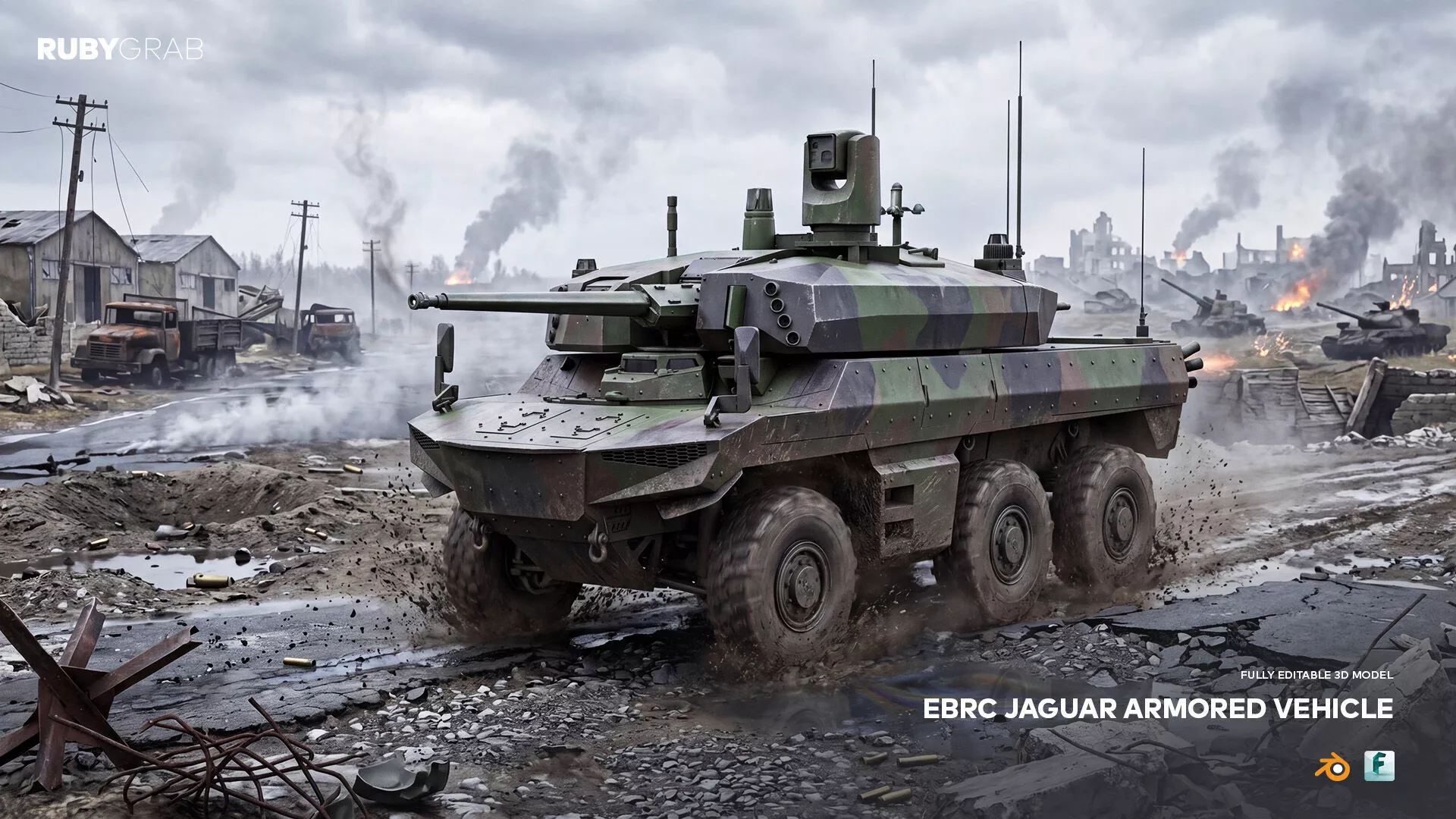 The EBRC Jaguar is a highly detailed 3D model of an advanced armored reconnaissance and combat vehicle, perfect for use in visualization, simulation, or game development. The package includes both .blend and .fbx file formats, providing flexibility for various 3D workflows and software compatibility. Additionally, a turntable animation is available at the bottom, offering a comprehensive view of the model's intricate design and features.