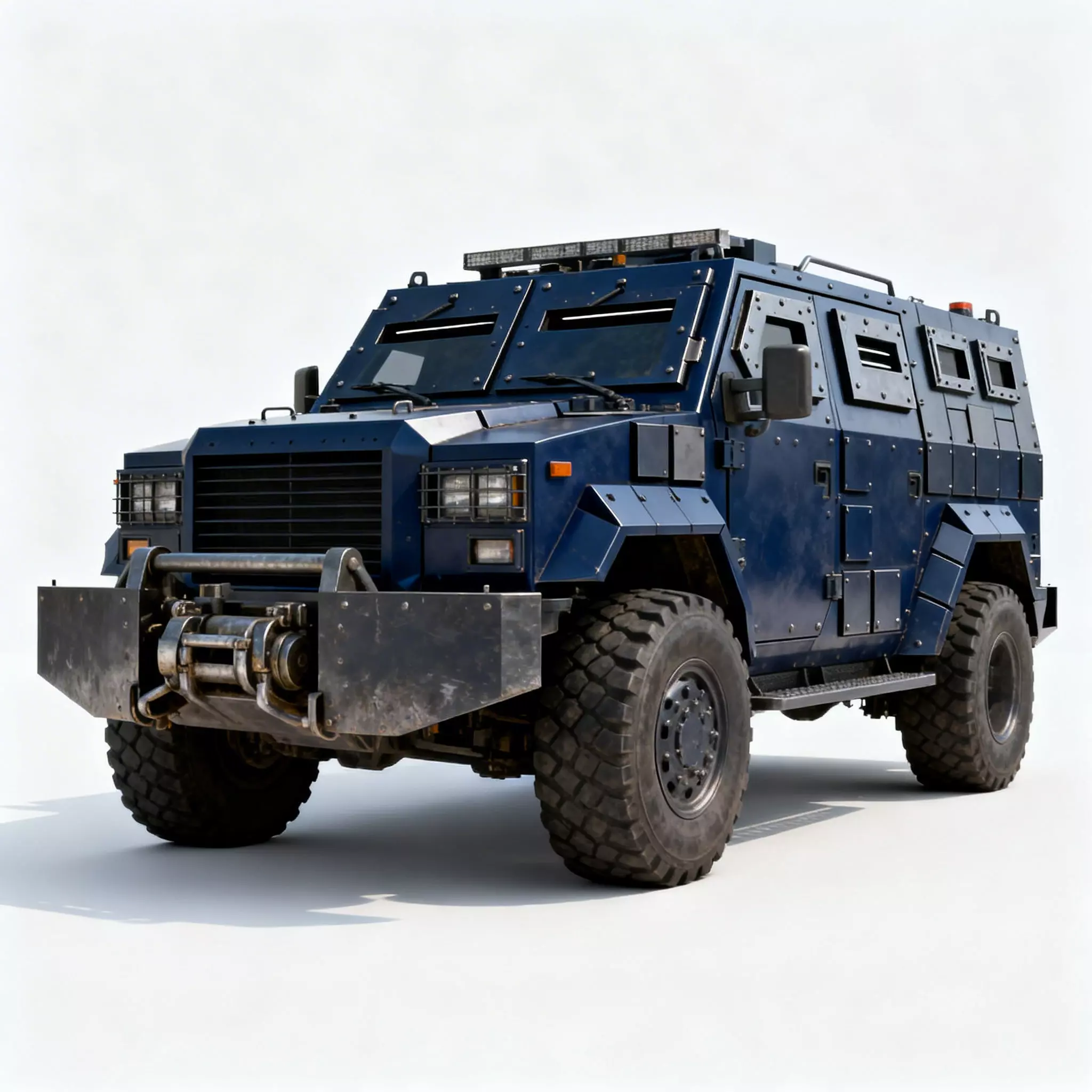 Dark Matte Blue Tactical PaintThe vehicle is finished in a uniform, dark matte blue paint cover. This non-reflective surface is designed for low-visibility operations in urban environments while maintaining a sleek and imposing tactical presence.