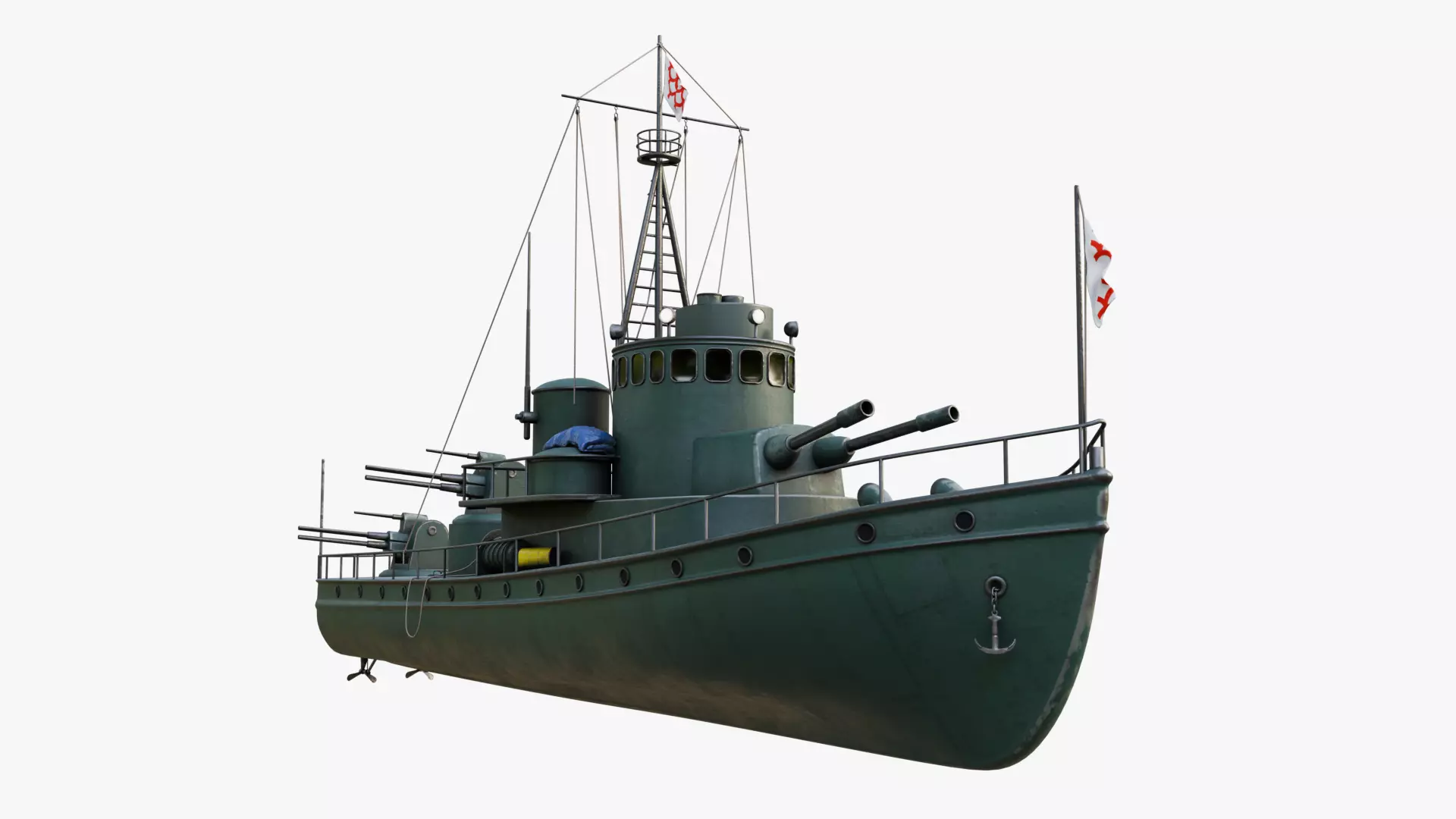 A sleek and sturdy patrol boat from the historical timeline, featuring a dark green hull with a matte finish, equipped with multiple gun turrets along the sides, and a flag of the nation flying high on the mast.