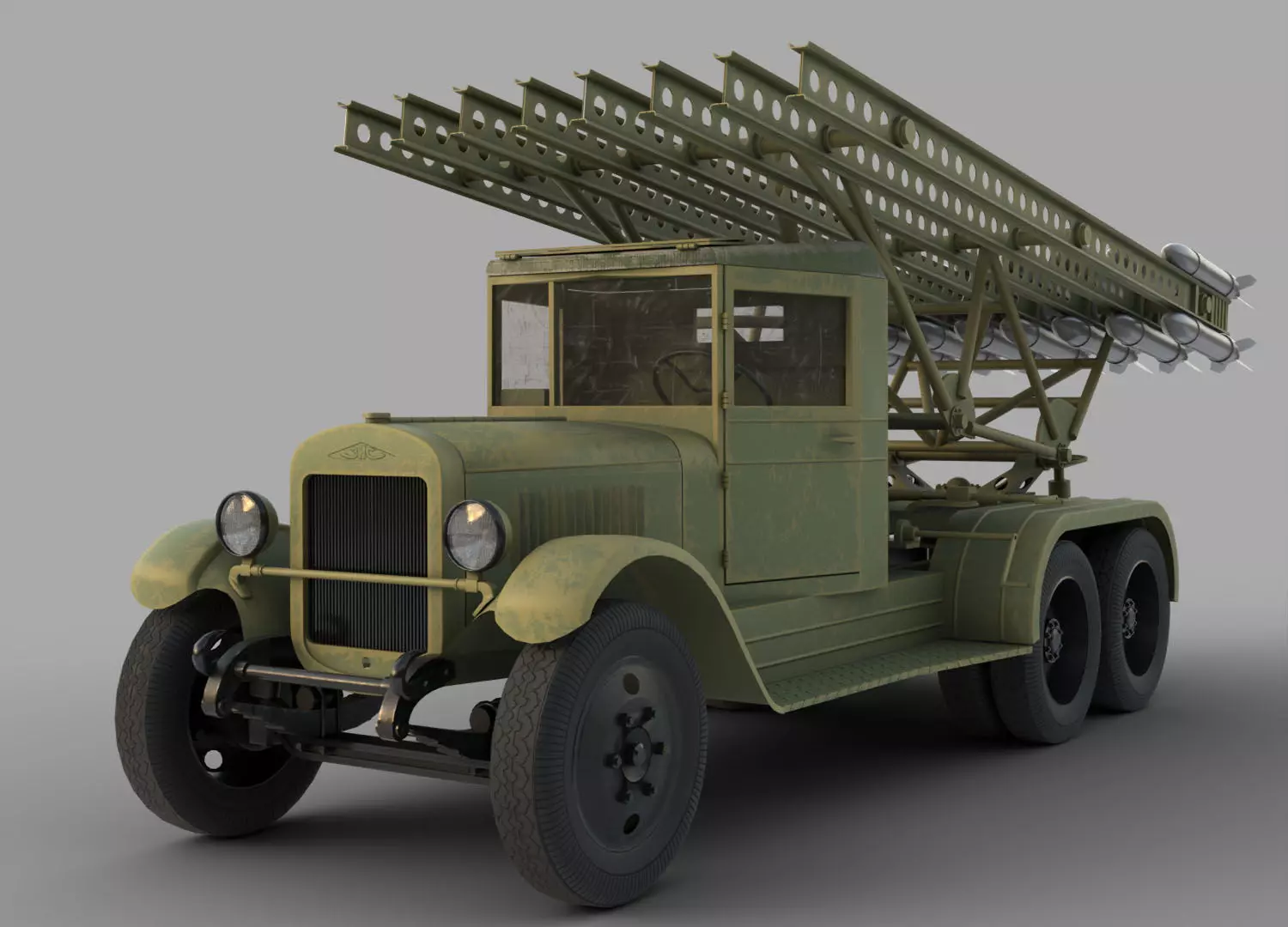 Low poly 3D model created in Blender, optimal render Cycles. Detailed enough for close-up rendering. Ready for multi-purpose use: interior elements, game attributes, advertising, etc. The 3D model has UV mapping andcomes with detailed textures. Texture resolution is 4096x4096 jpg.WinRAR texture archive includes:• Primary color (albedo)• Normal map• Occlusion• Roughness• GlossinessThe launcher of the mobile multiple-charge rocket launcher system BM-13 machine, popularly nicknamed Katyusha, was a ZIS-6 truck, in place of the body of which 16 groove-type guides were mounted on a special frame, located along the axis of the car in two tiers. Every two guides were connected (paired), forming a single structure called a twin.... it seemed that the earth stood on end. For a second, everything froze. The exchange of fire on the front line ceased. A moment - and explosions thundered, destroying everything - troops, military equipment, ammunition, fuel, everything that the enemy had concentrated at this station. Several minutes passed, and a raging sea of fire burst out over the station. The surviving German soldiers fled in horror, abandoning their weapons and equipment ...BM-13 fought on all fronts of the Great Patriotic War, becoming one of the symbols of victory.