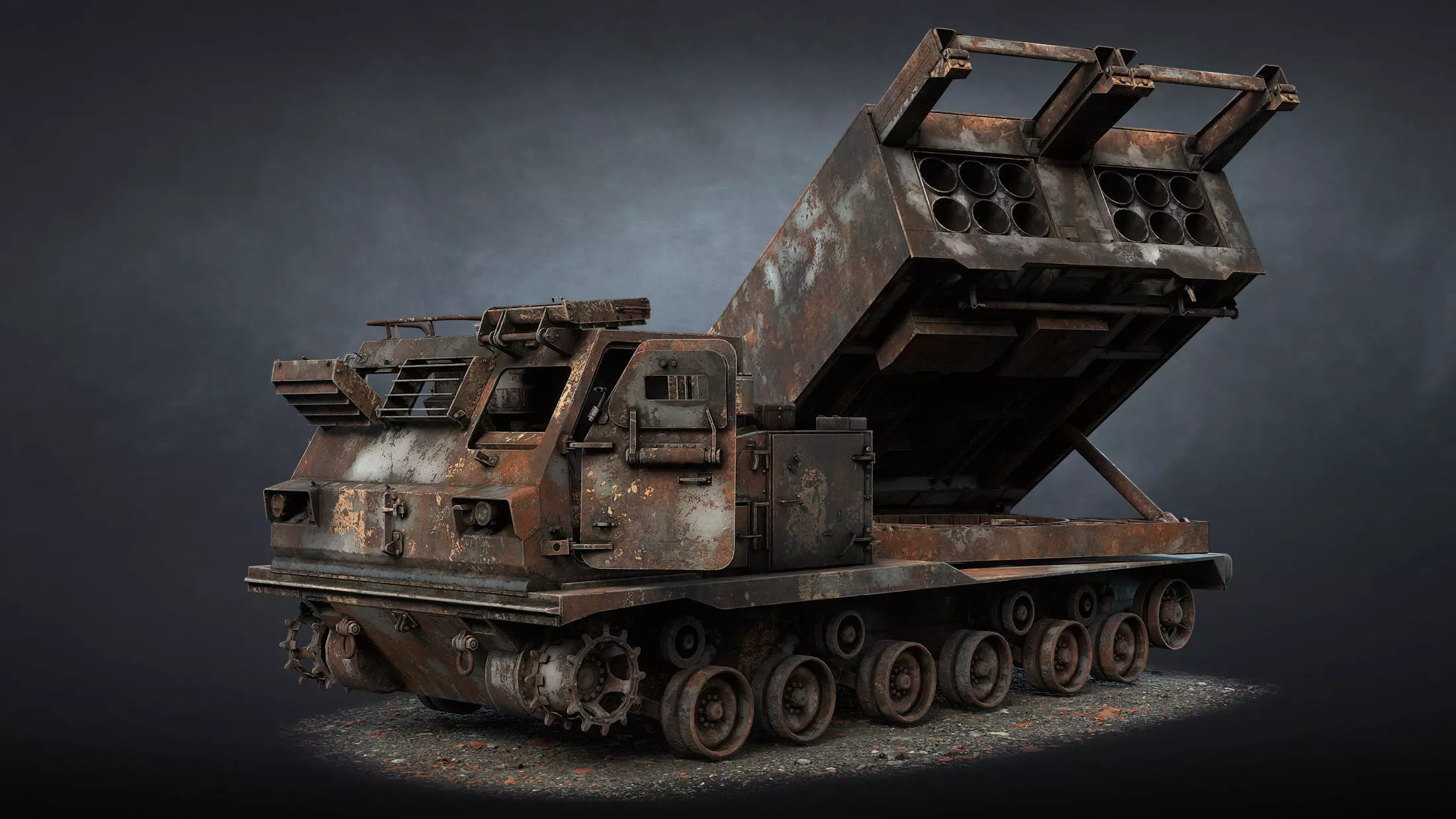 The game low-poly 3d-model of burnt M270 Multiple Launch Rocket System.