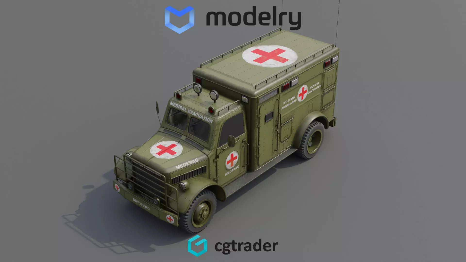 A retro-inspired medical evacuation vehicle reminiscent of mid-20th century military ambulances, featuring a classic olive green paint job with vintage medical insignia and siren, complete with wooden stretcher racks and old-fashioned medical equipment for a nostalgic touch.