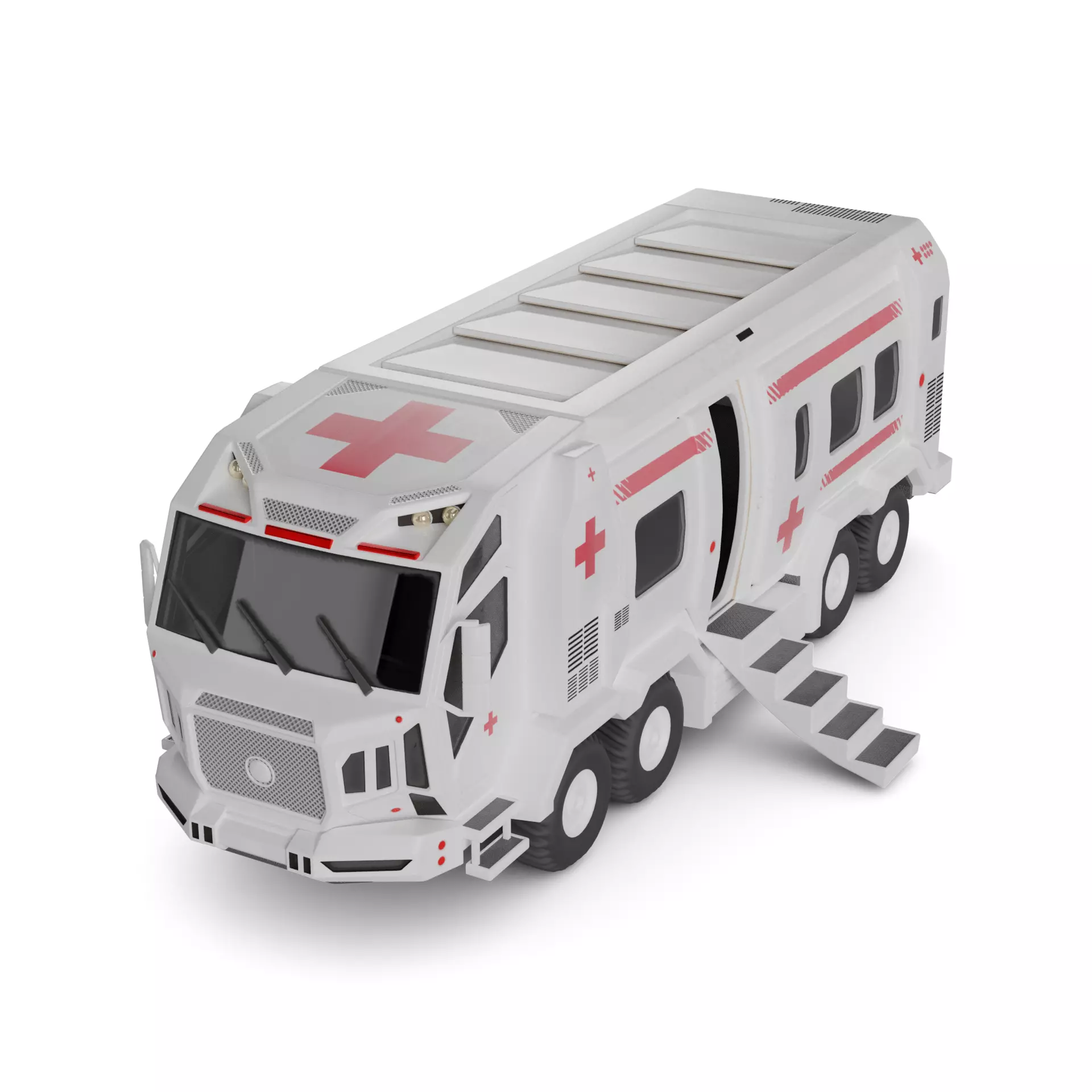 A sleek and modern medical evacuation vehicle with a bold red cross symbol prominently displayed on its white exterior, equipped with state-of-the-art medical equipment and spacious interior to accommodate multiple stretchers and medical personnel, designed for swift and efficient transportation of wounded soldiers on the battlefield in current times.