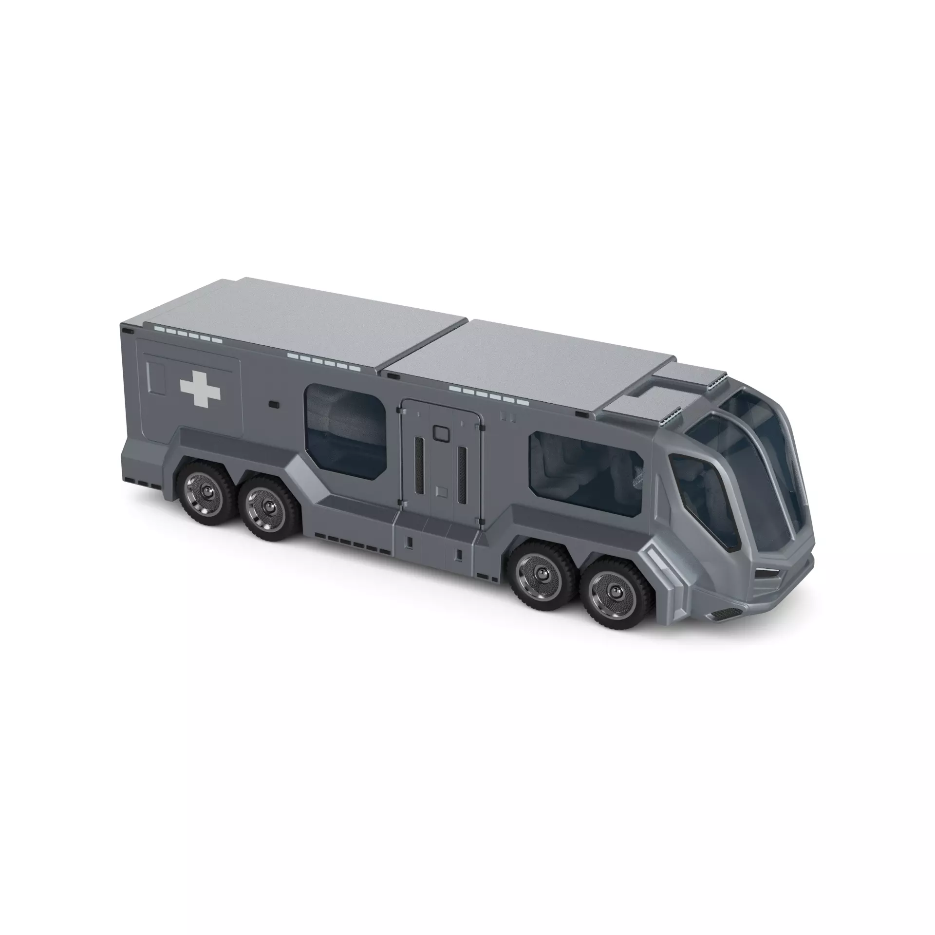 A futuristic medical evacuation vehicle designed for swift and efficient transport of injured soldiers, featuring a sleek and aerodynamic shape with a metallic silver exterior, equipped with advanced medical equipment and large transparent windows for visibility.