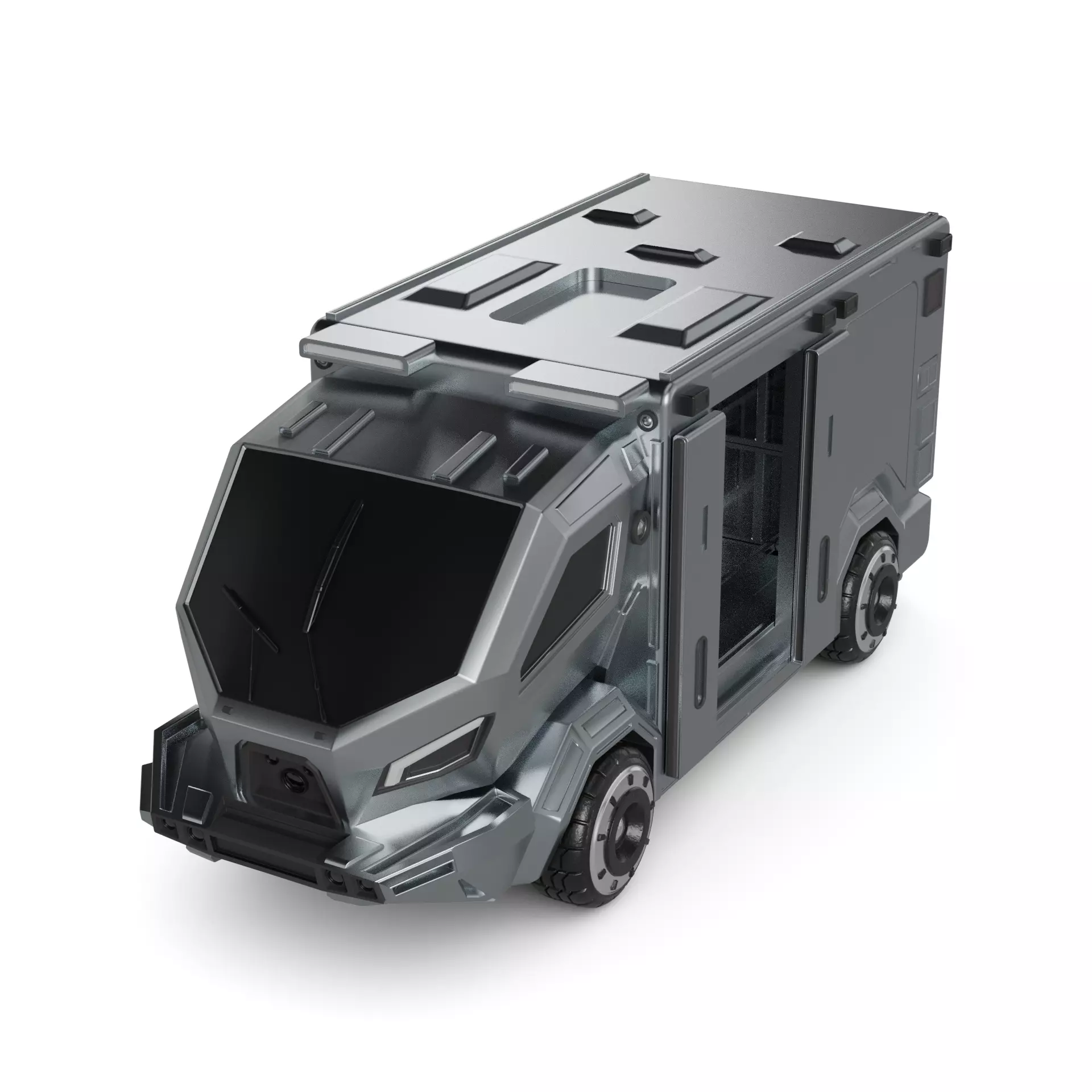 A futuristic medical evacuation vehicle with a futuristic design, featuring sleek silver panels, advanced technology interfaces, and automated medical systems, capable of rapid deployment and evacuation of casualties in high-intensity conflict zones, providing critical lifesaving care in the current era of modern warfare.