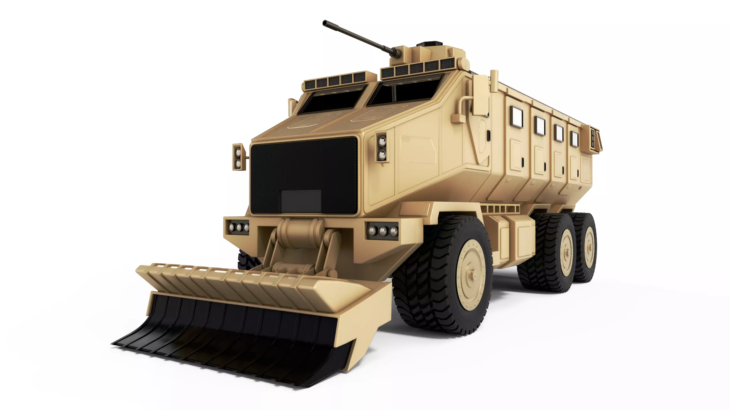 This armored engineer vehicle exudes a rugged appearance, with a boxy frame and a disruptive pattern of tan and brown, showcasing a retractable dozer blade at the front and a sturdy winch for towing operations.