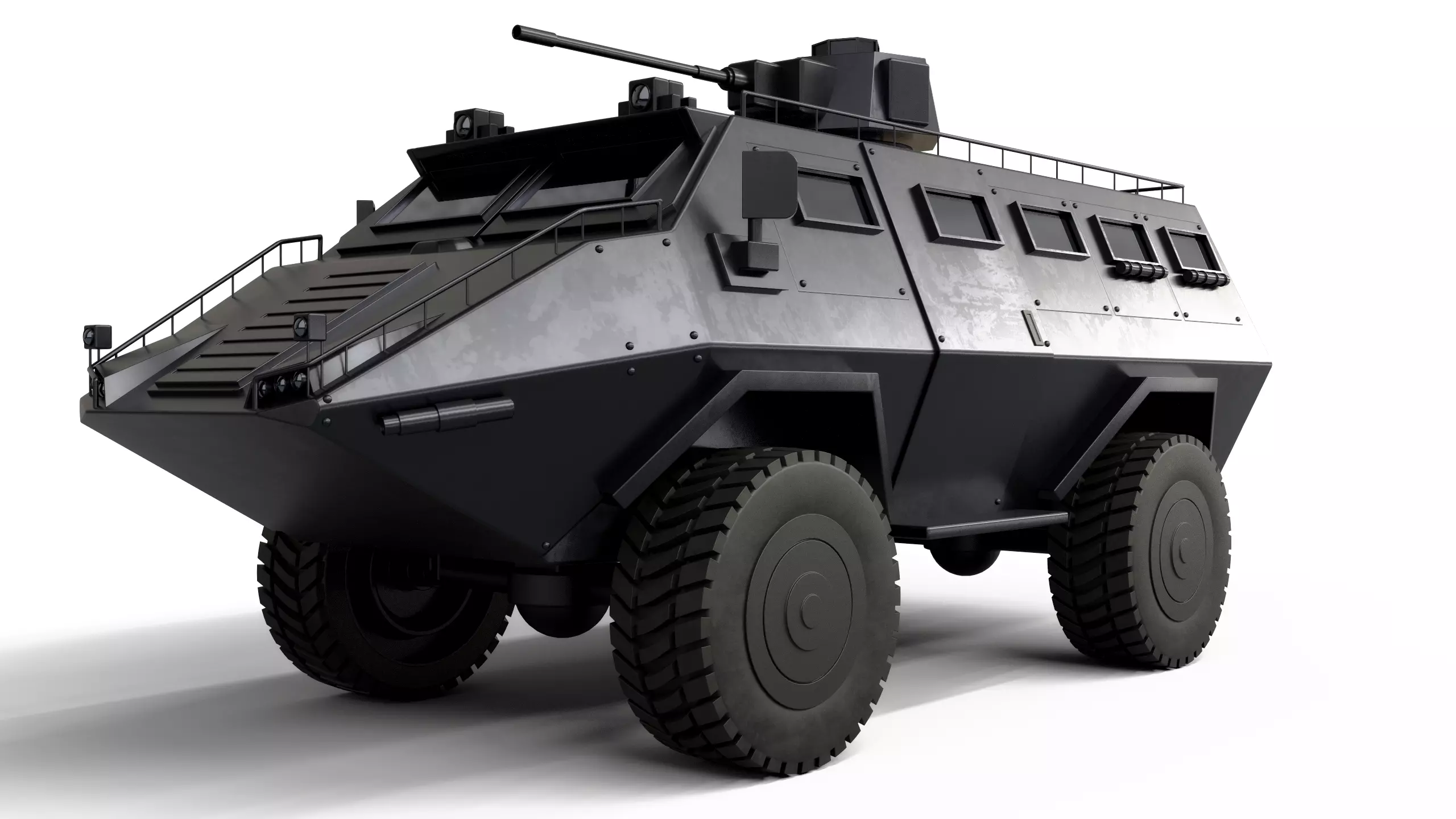 An Armored Personnel Carrier designed for historical warfare, showcasing a sleek and streamlined silhouette with a matte black finish. The surface is adorned with intricate engravings of war motifs, adding a touch of elegance to its intimidating presence. The wheels are encased in thick, reinforced rubber, providing a smooth ride over various terrains, while the tinted windows offer a glimpse into the well-protected interior, ready to transport troops safely through hostile environments.