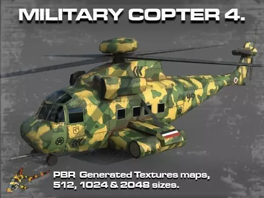Helicopter based on popular US military and coast guard services design. Main and rear rotor blades, front and rear wheels are separated to allow for animation.Texture come in sizes 512, 1024 and 2048. Metallic, Normal, Ambient, Specular, Roughness. Height, Albedo.