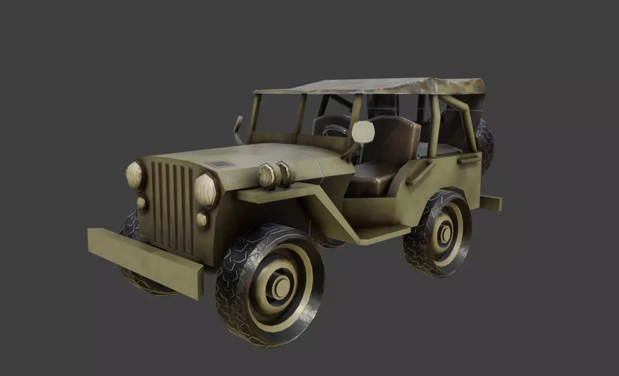 A detailed 3D Military Jeep designed for game and cinematic environments. Modeled with a focus on realistic proportions and functional details, this vehicle captures the rugged look of classic military transport.