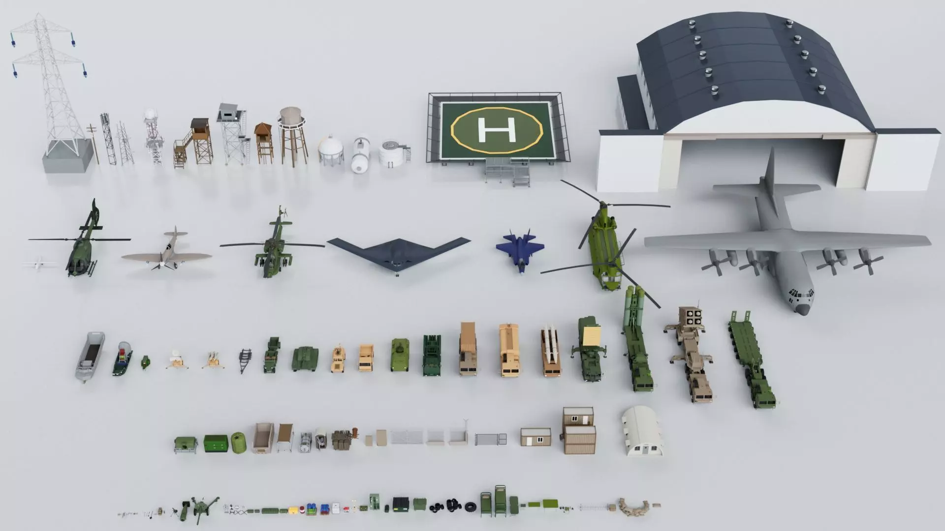 Items(x100):Aircraft, Plane, Helicopter, Apache, Chinook, Hercules, Fighter Jet Plane, Drone, Tank, Boat Trailer, LVCP, MIM 104 Patriot, Ballistic Missiles, Rocket, Mobile Radar, Airboat, Tank Trailer, S 400 Triumf, Tanker Military Truck, Container Military Truck, Light Tactical Vehicle, Willys MB Jeep, Missile launcher, Military Generator, Weapons, Atomic Bomb, Tower, Knife, Gun, Pistol, Bullet, Airport Hangar, Helipad, Guard Tower, Water Tower, Anteena, Luggage, Locker, Bed, Recycling Dumpster, Light Portable, Transformer, Portable Toilet, Tire, Storage Tank, LPG Tank, Fire Extinguisher, Fencing Razor Wire, Tent, Fuel Tank, Crate, Military Container, Airdrop, Shovel, Radio Tower, Walkit Talkie, Bottle, Water Conatiner, M142 HMARS, Armoured Personnel Carrier and many more