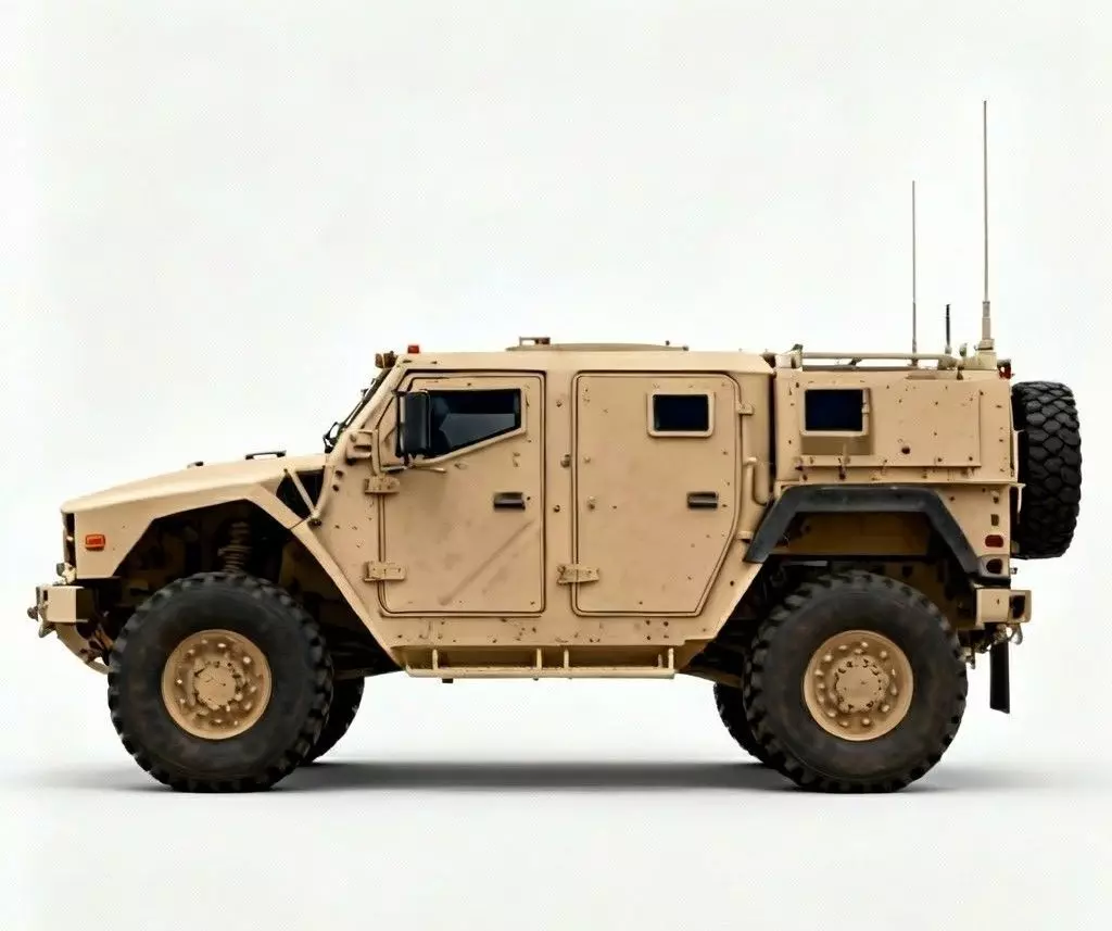Desert Sand Paint The vehicle is painted in a solid, matte tan color. This desert sand finish helps it blend perfectly into dry, arid environments, which is standard for modern military operations in the Middle East.