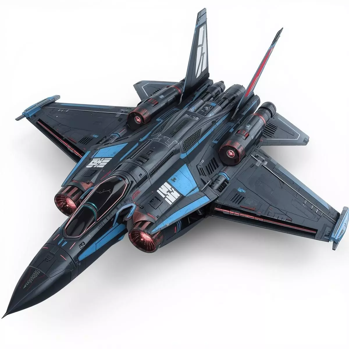 The fighter features a massive, angular body with four prominent jet engines and swept-back wings. It is rendered in a dark, stealthy matte black/gray metallic finish accented by vibrant electric blue and crimson red panels and light lines. The twin engine intakes glow with red internal light, emphasizing powerful propulsion. The tandem cockpit and high level of detail on the exposed mechanics underscore its status as an elite, high-performance war machine.