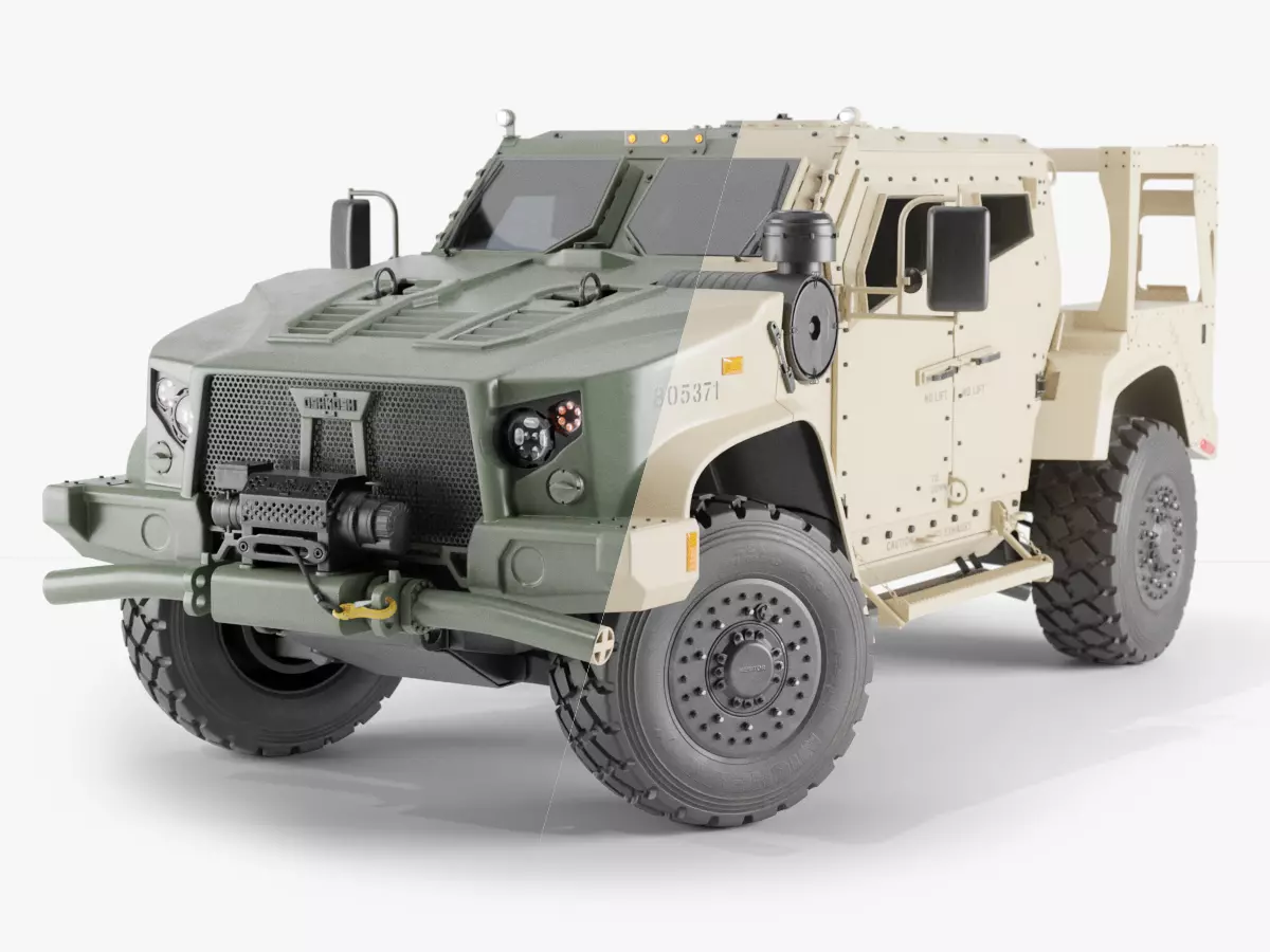 This is a high poly 3d model of an Oshkosh JLTV military vehicle which stands out with a clear topology, detailed textures, and a full rig. Modelled, rigged and textured in blender 5.1