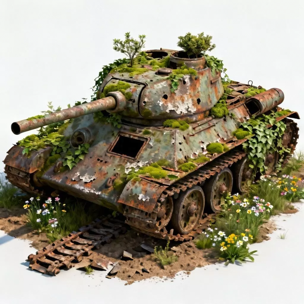 The model features a vintage military tank, reminiscent of WWII-era designs, now consumed by vegetation. The metal hull is heavily corroded, showcasing layers of vibrant rust and peeling paint. Lush patches of moss, climbing ivy, and small saplings sprouting from the open hatches transform the weapon of war into a garden. The tank rests on a patch of earth dotted with wildflowers and broken track links, creating a complete, ready-to-render vignette.
