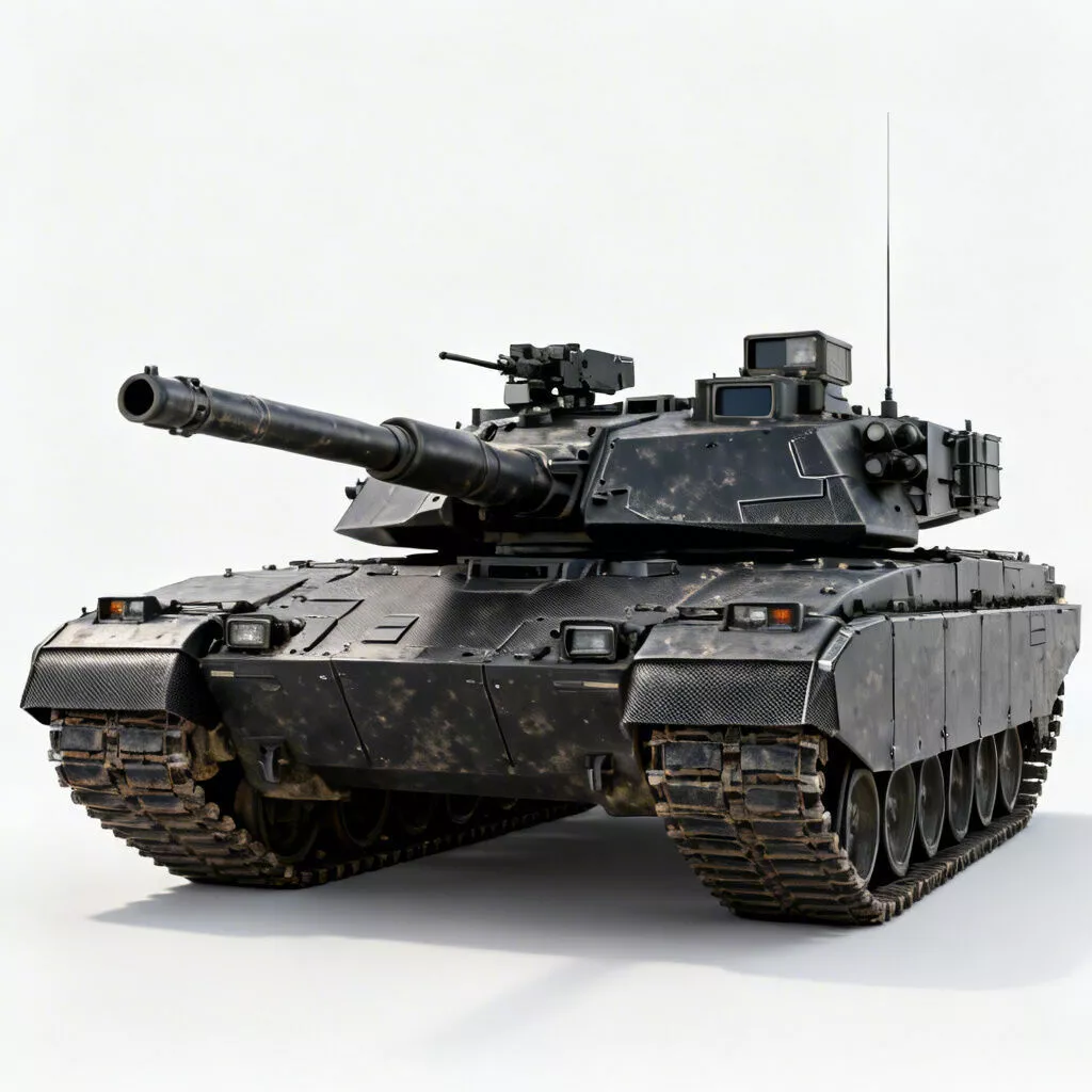 This expertly crafted 3D asset features a massive, modern main battle tank. It is covered in a realistic texture of dark, weathered tactical paint with subtle accumulations of battlefield dust and grime. The model showcases extraordinary detail: a massive, prominent main cannon, thick angular composite armor panels, and a reinforced front glacis plate. The complex turret is highly detailed, equipped with a top-mounted remote heavy machine gun, advanced optical sensors, a commander's panoramic sight, smoke grenade launchers, and a tall communication antenna. The heavy-duty continuous metal tracks are weathered and lightly caked with dried mud, resting on detailed road wheels and protected by thick armored side skirts. The realistic PBR material definition enhances its cinematic quality, highlighting every armor plate, sensor lens, and mechanical component.
