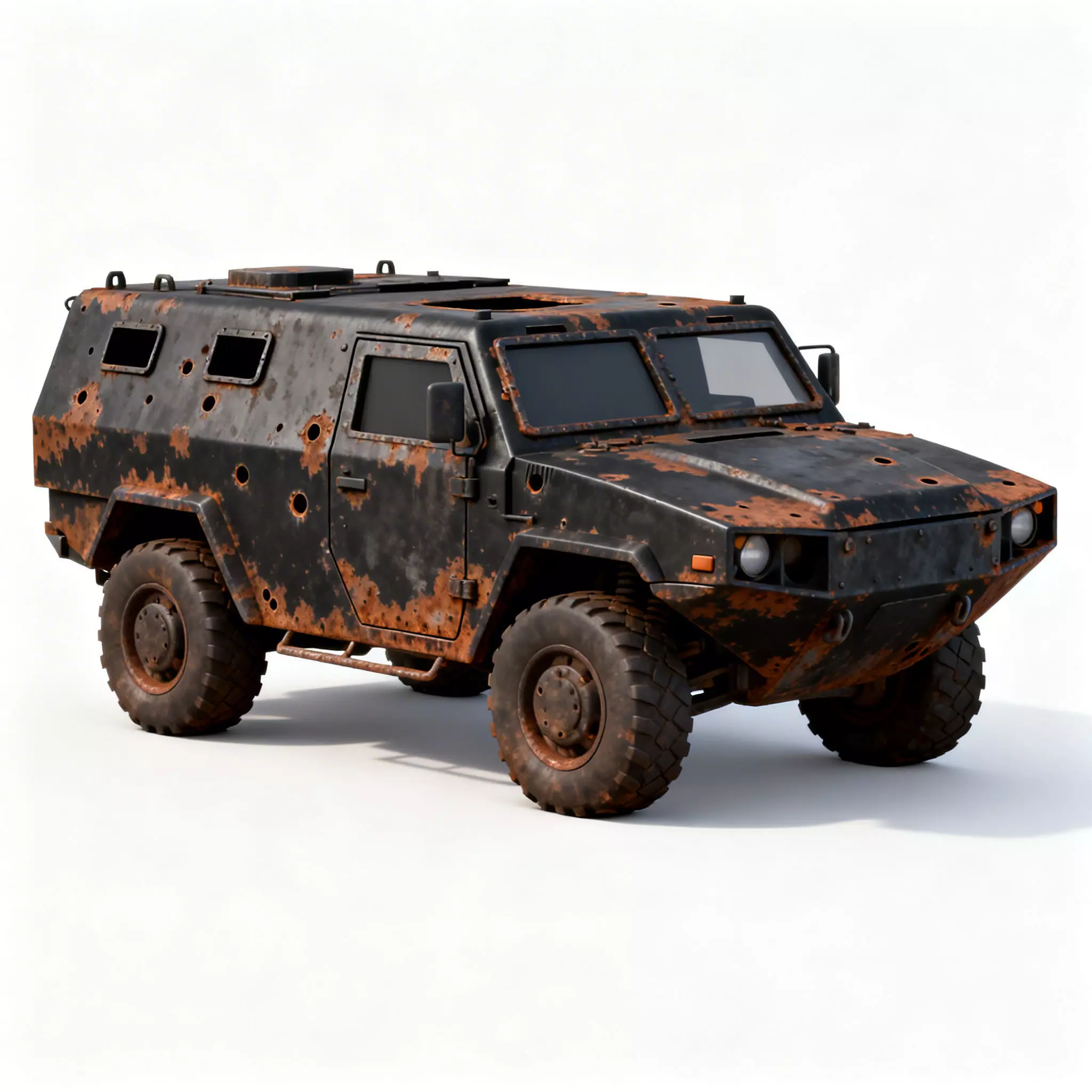 The Overall ConceptThis 3D model represents a rusted stealth Armored Personnel Carrier (APC) designed with a rugged, wasteland aesthetic. It features a low-profile, angular fuselage with heavy-duty off-road tires, making it an ideal choice for post-apocalyptic survival games or high-stakes desert combat scenarios.