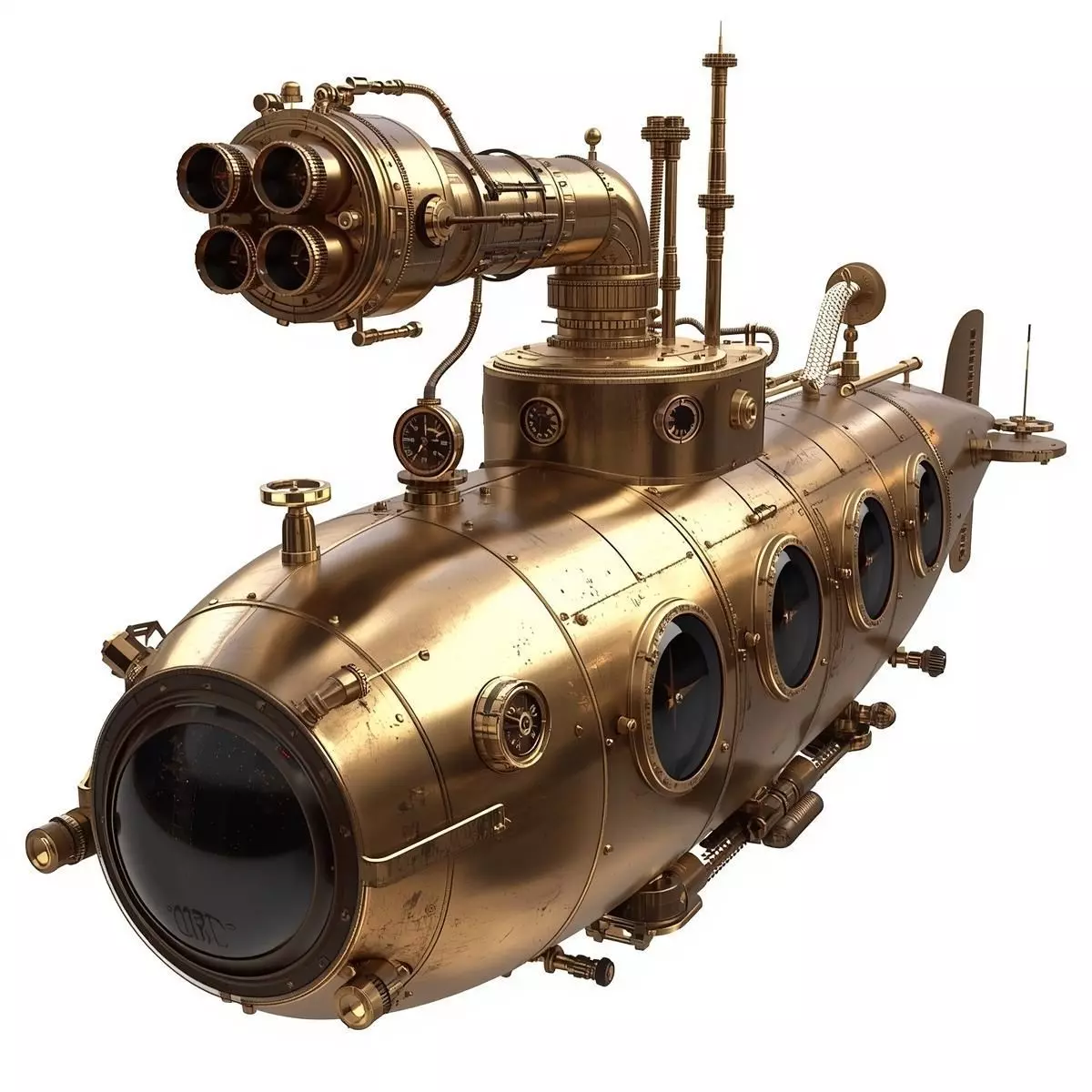 Steampunk Reconnaissance Submarine 3D ModelDescriptionA premium, high-quality 3D model of a reconnaissance submarine featuring a streamlined, slim brass body and a sophisticated Victorian industrial underwater aesthetic. The vessel is crafted with a polished brass hull and is equipped with a massive, articulated mechanical periscope assembly featuring four individual optical lenses.