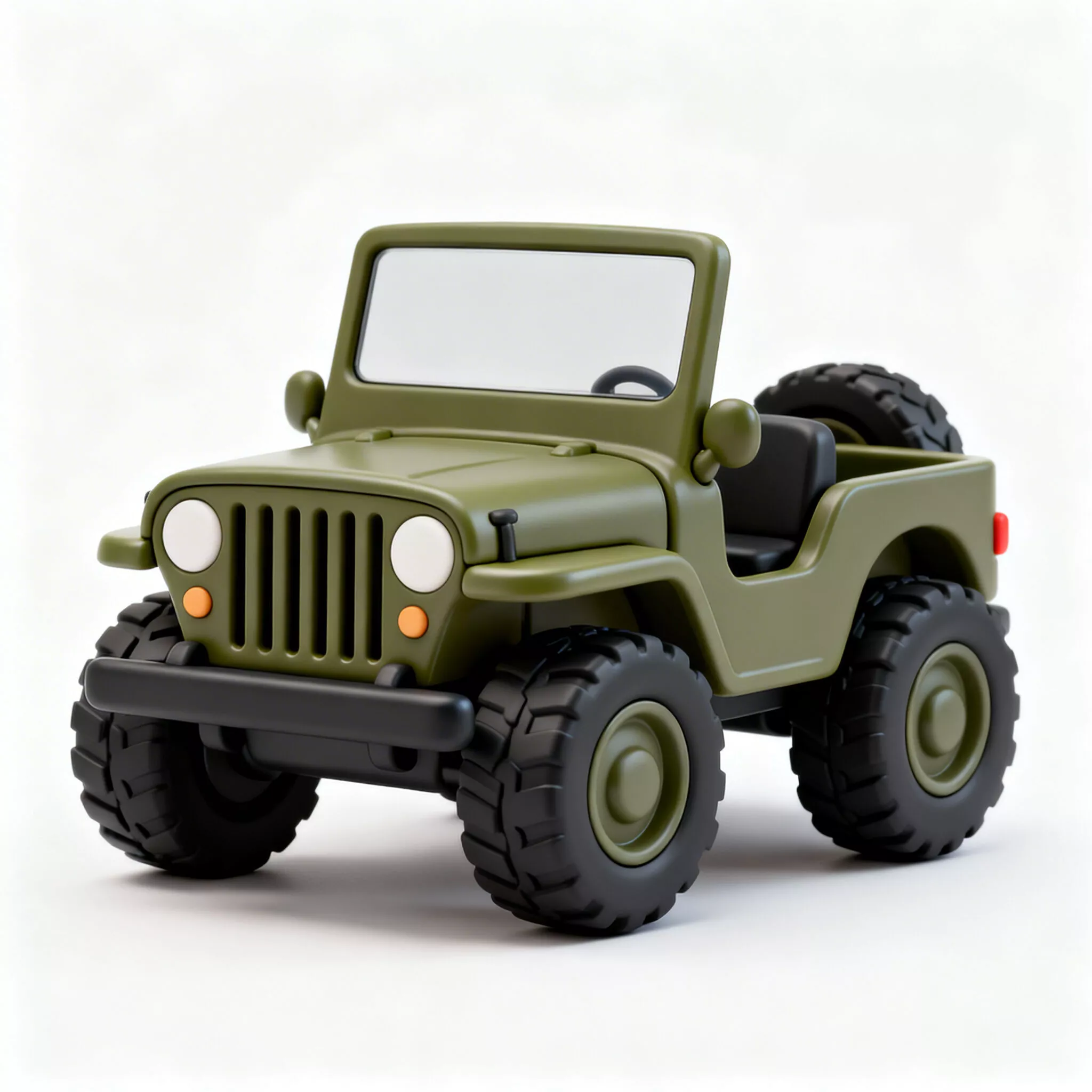 Classic Offroad Design: Incorporates recognizable military vehicle elements like the slotted grille and rugged tires into a friendly, approachable silhouette.