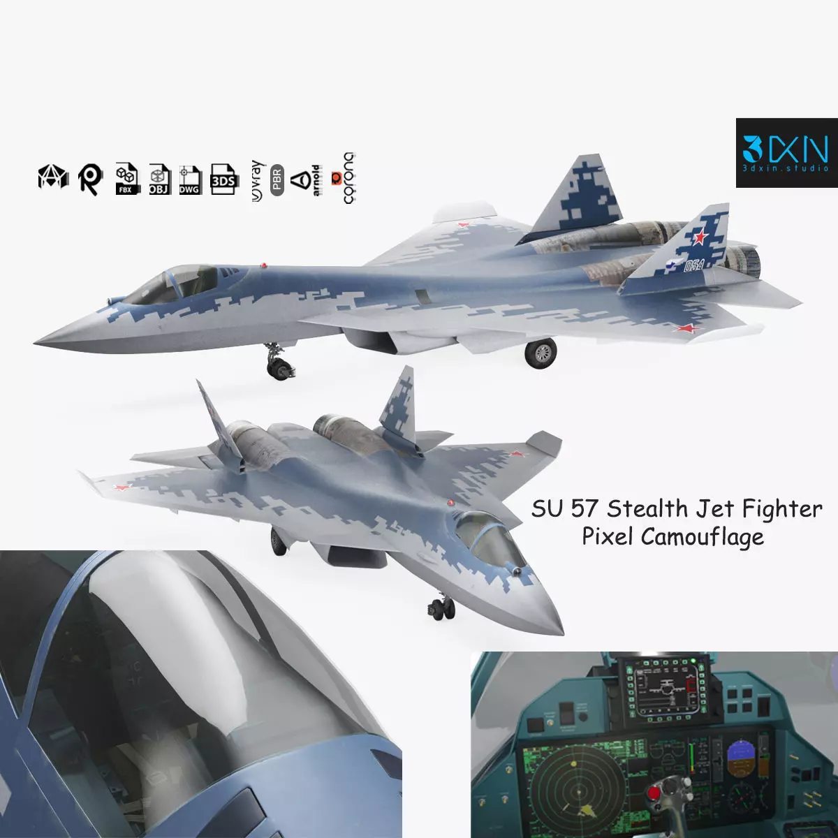 SU 57 Stealth Jet Fighter Pixel Camouflage is a high-quality, photo-realistic 3d model that will enhance your rendering projects' detail and realism. The model has a fully textured, detailed design that allows for close-up renders, and was modeled in 3ds Max 2018 and has a 3ds Max 2015 version, and rendered with V-Ray. Renders have no post-processing.