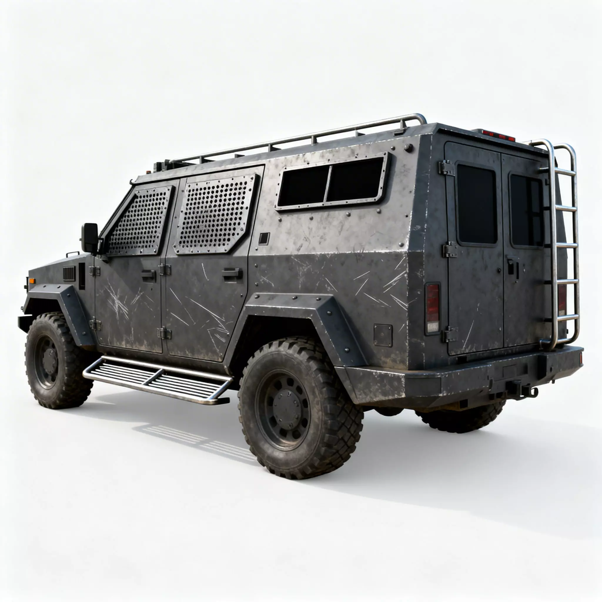 Perforated Protective PlatingThe side windows are equipped with heavy-duty, perforated steel armor plates. These chunky, bolted-on geometric details provide a high-contrast visual element against the dark body, reinforcing the vehicle's tactical utility and protective capabilities.