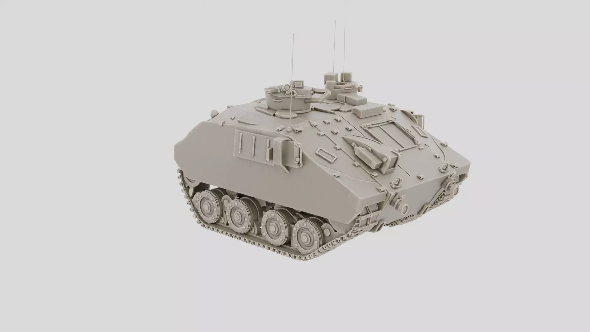 This 3D model depicts a tracked armored command post vehicle created as a static printable asset. The model features a tall armored hull with extended rear compartment shapes, representing mobile command infrastructure without functional doors or electronics. All details are simplified into solid geometry for strength. The model contains no textures and relies entirely on geometry. There is no rigging or animation. Tracks are modeled as thick continuous forms to ensure print reliability. The proportions are generic and suitable for military command scenes, war dioramas, or educational displays. The surface geometry supports easy post processing and painting. The model is untextured and ready for 3D print.