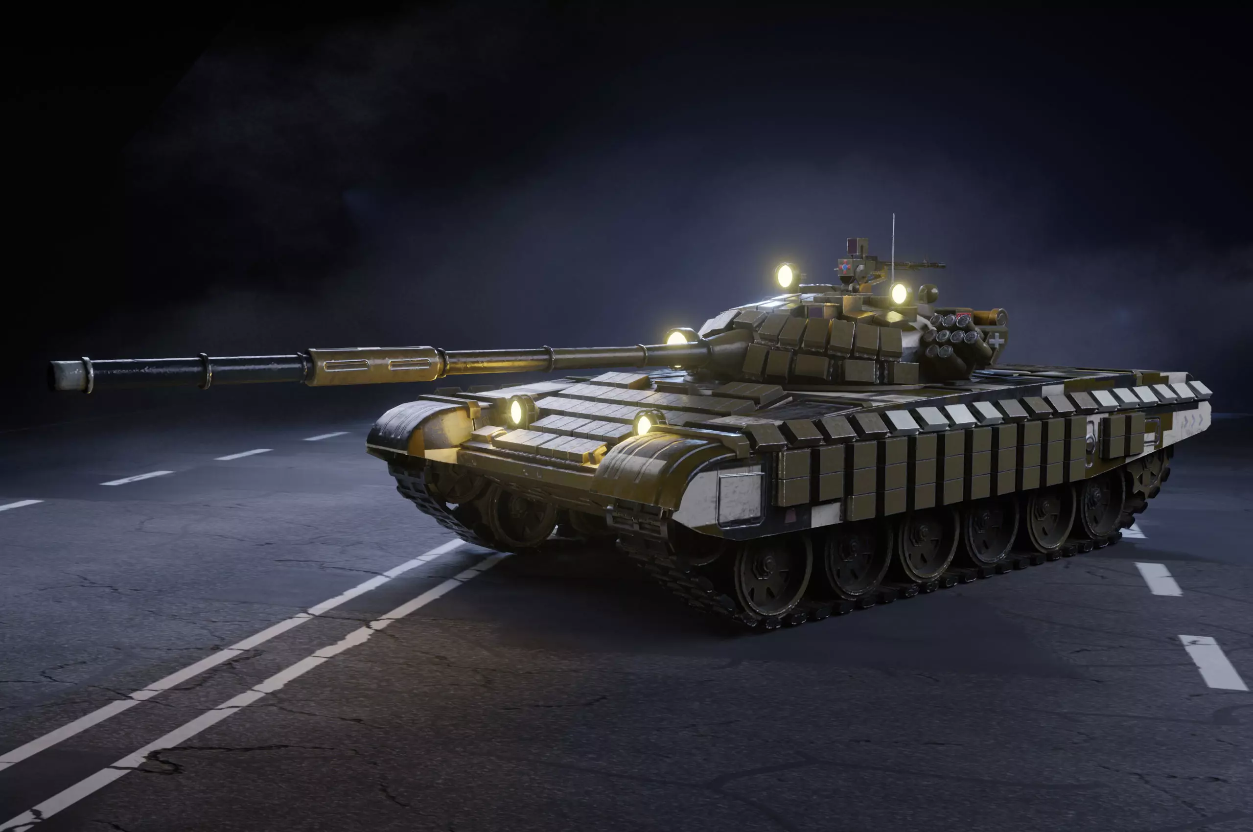 This 3D model depicts the Ukrainian T-72 tank, modernized for use by the Ukrainian armed forces. The texture quality of this model is 4K(base color, metallic, ambient occlusion, height, roughtness, emissive and normal maps).
