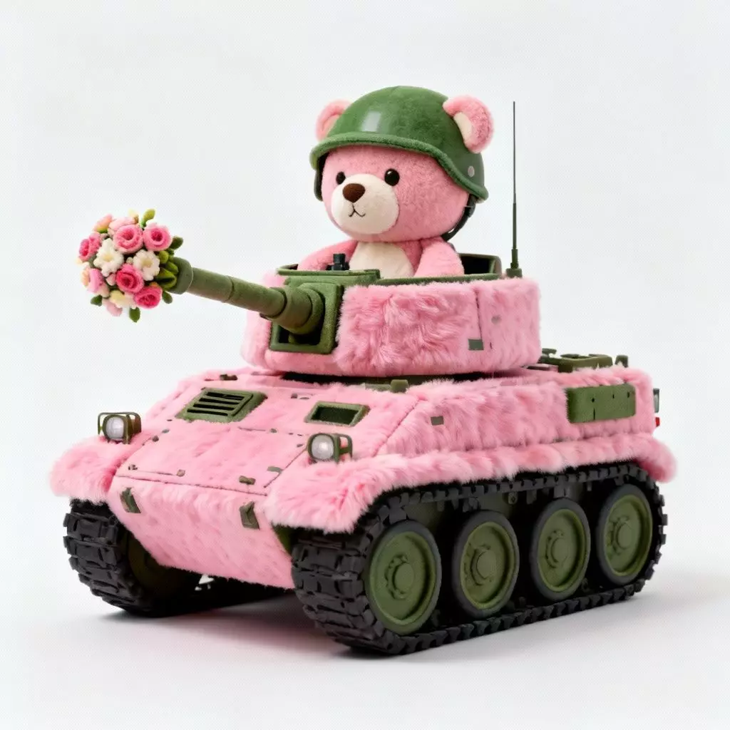 Pink Fur Armor Instead of cold, hard metal, the entire body and turret of the tank are covered in soft, fluffy pink fur. This unique texture gives the vehicle a warm, tactile feel, looking more like a giant stuffed animal than an armored carrier.