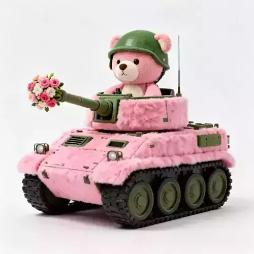 The Bear Driver Populating the commander's hatch is an adorable pink teddy bear. Wearing a classic green military helmet, the bear adds character and personality to the vehicle, acting as a friendly mascot for the player.