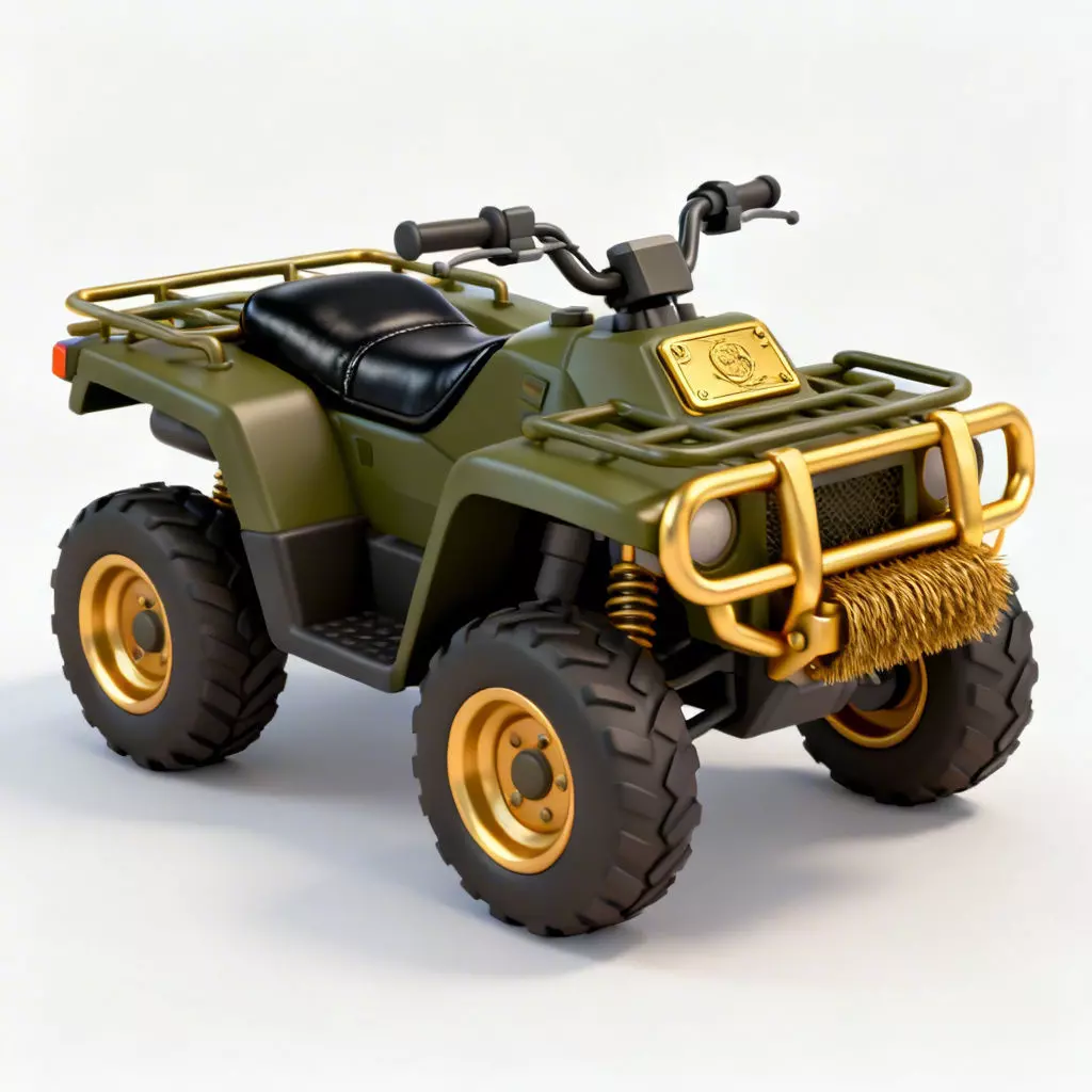 Gilded Front Grille & HardwareTo emphasize its elite status, the ATV features a stunning polished gold front bumper, grille frame, and a decorative gold plaque on the hood. These metallic highlights provide a premium contrast against the matte green bodywork and signal that this is a top-tier piece of equipment.